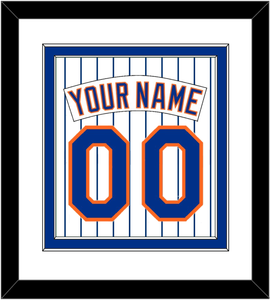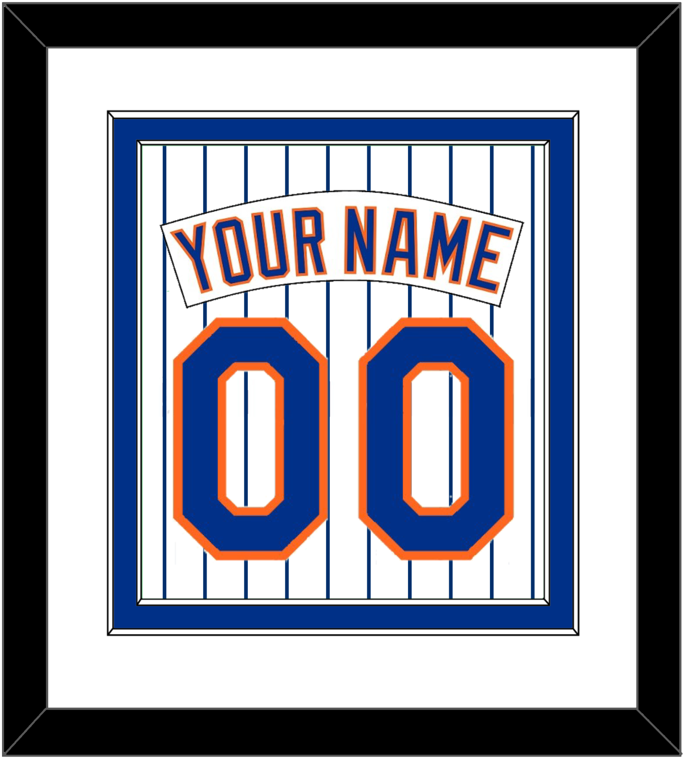New York Home Pinstripes Jersey (1983 Through 1986) Nameplate & Number. Double Mat Cut: White Mat Over A Blue Mat. White Nameplate And Blue Number Mounted On A Pinstripe Background. Black Frame.