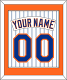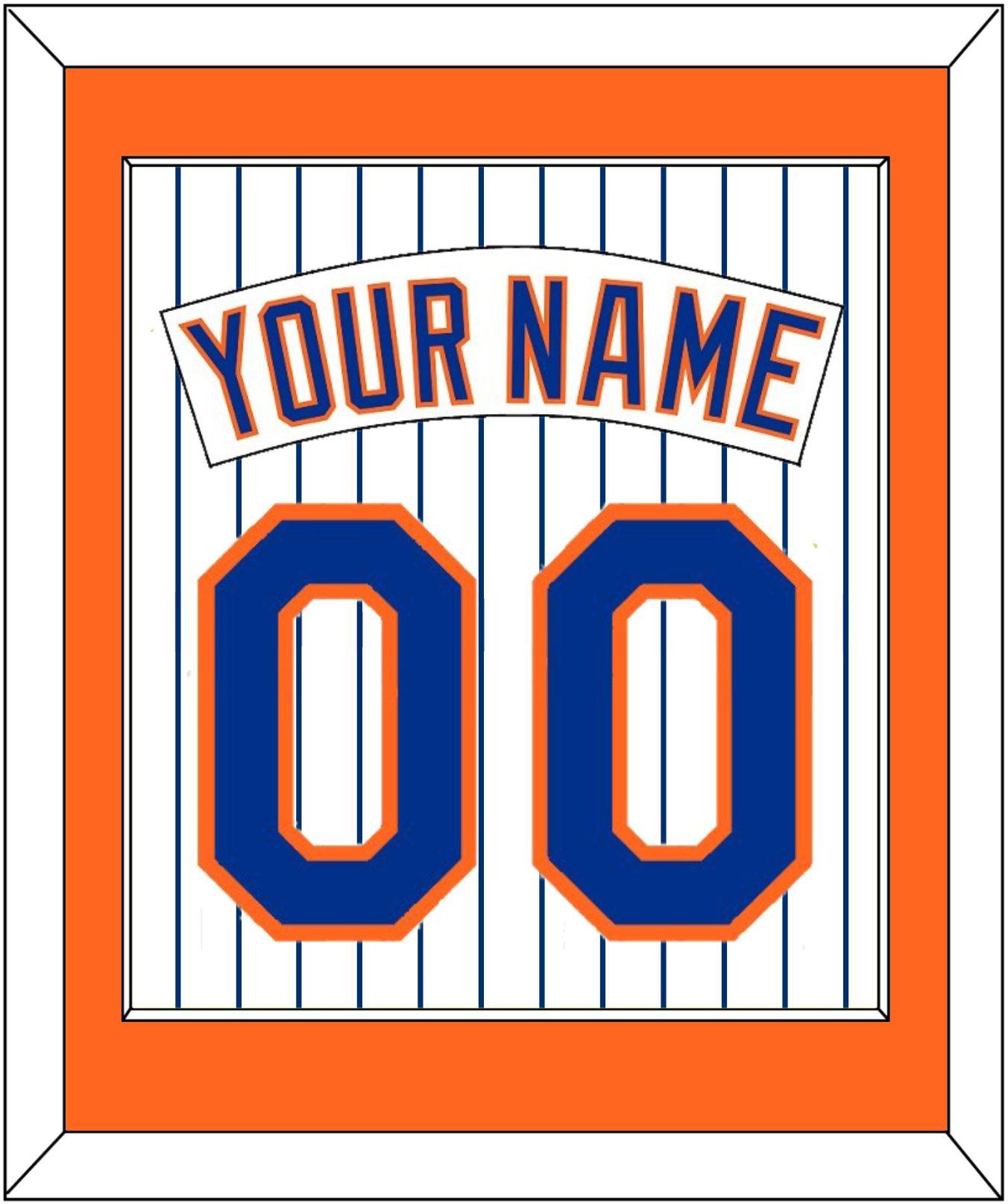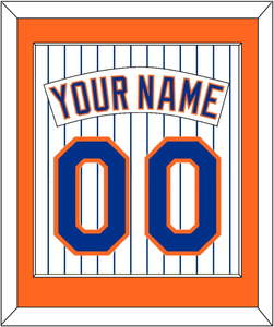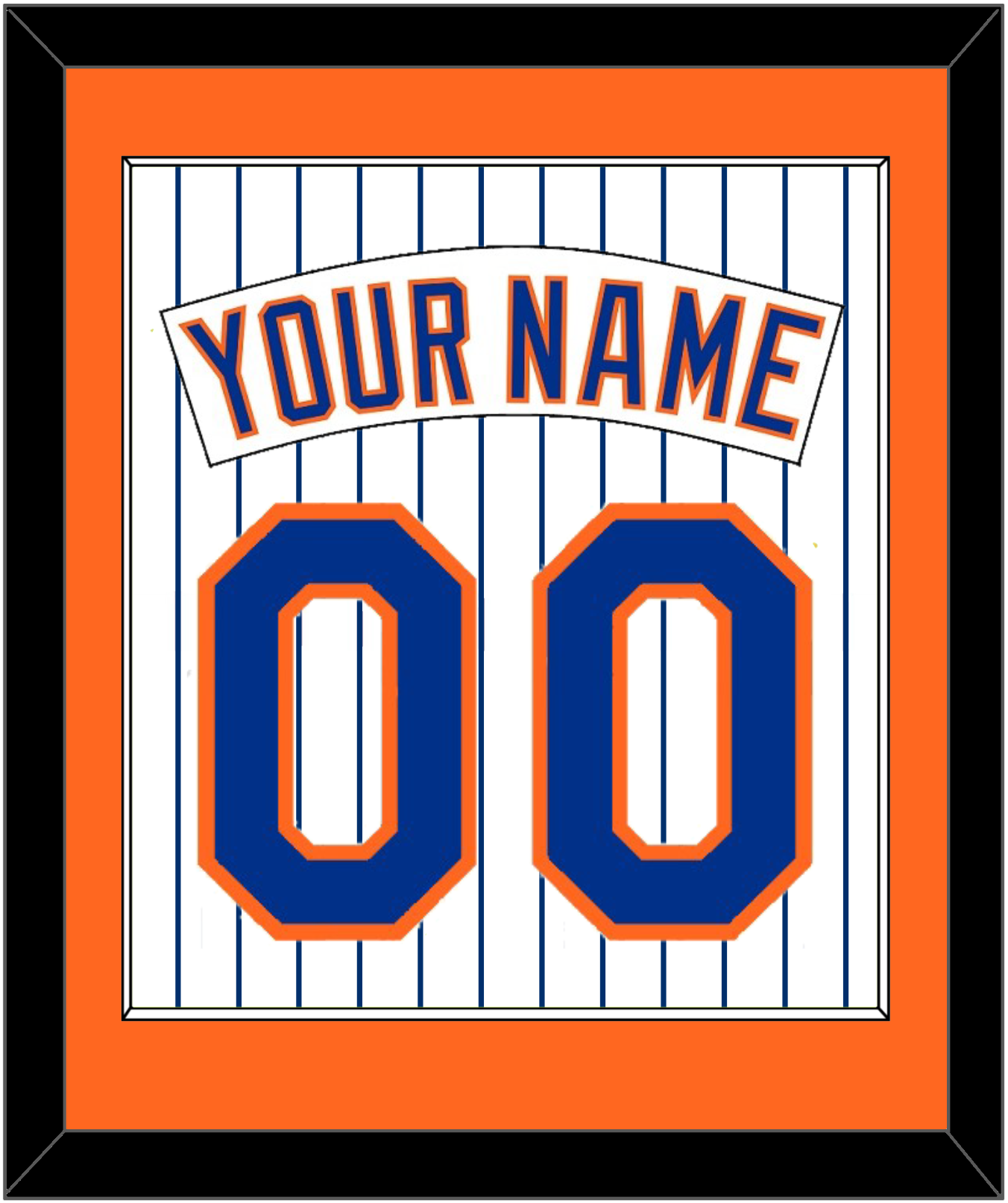 New York Home Pinstripes Jersey (1983 Through 1986) Name & Number. Orange Mat With White Nameplate And Blue Number Mounted On Pinstripes. White Or Black Frame.