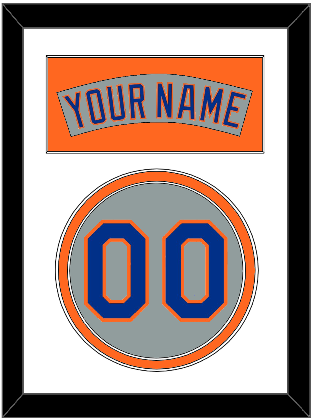 New York Road Gray Jersey (1982 Through 1986) Nameplate & Number. Nameplate Is Single Mat Cut: White Mat With Gray Nameplate Mounted On An Orange Mat. To Match The Jersey, Number Is Double Mat Cut: White Mat Over An Orange Mat, Blue Number Mounted On A Gray Mat. Black Frame.