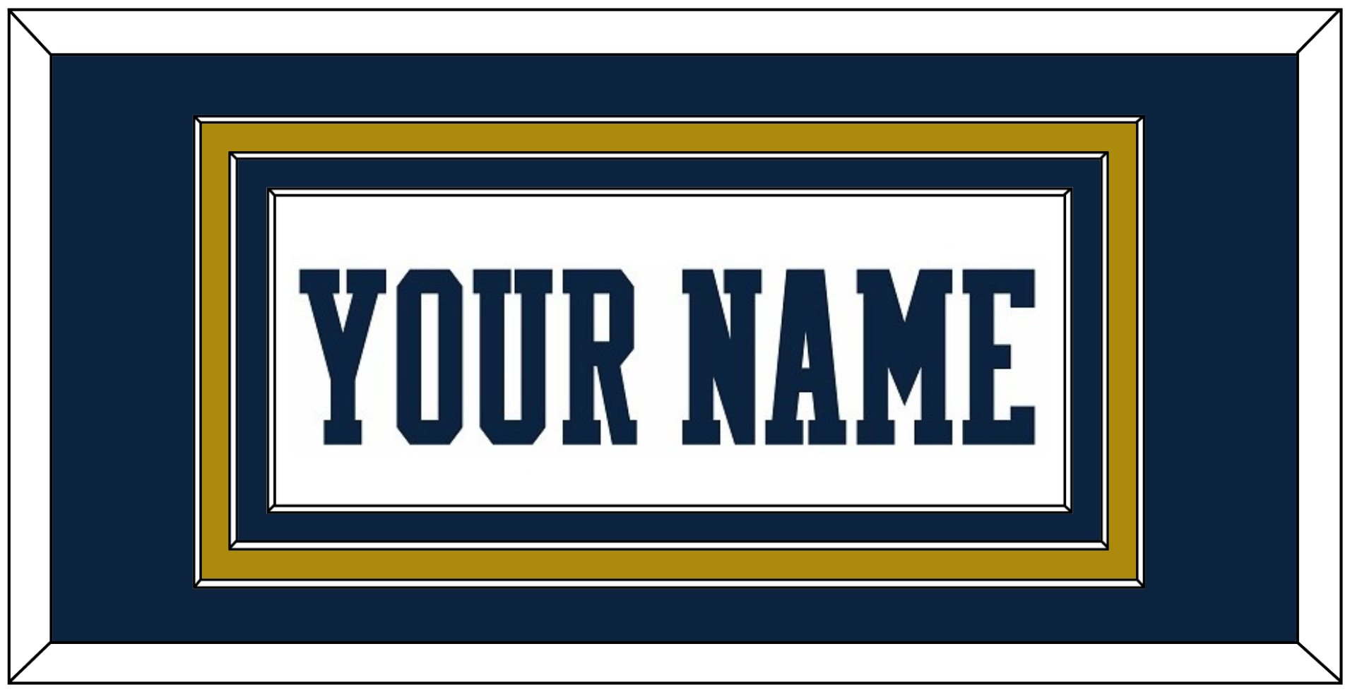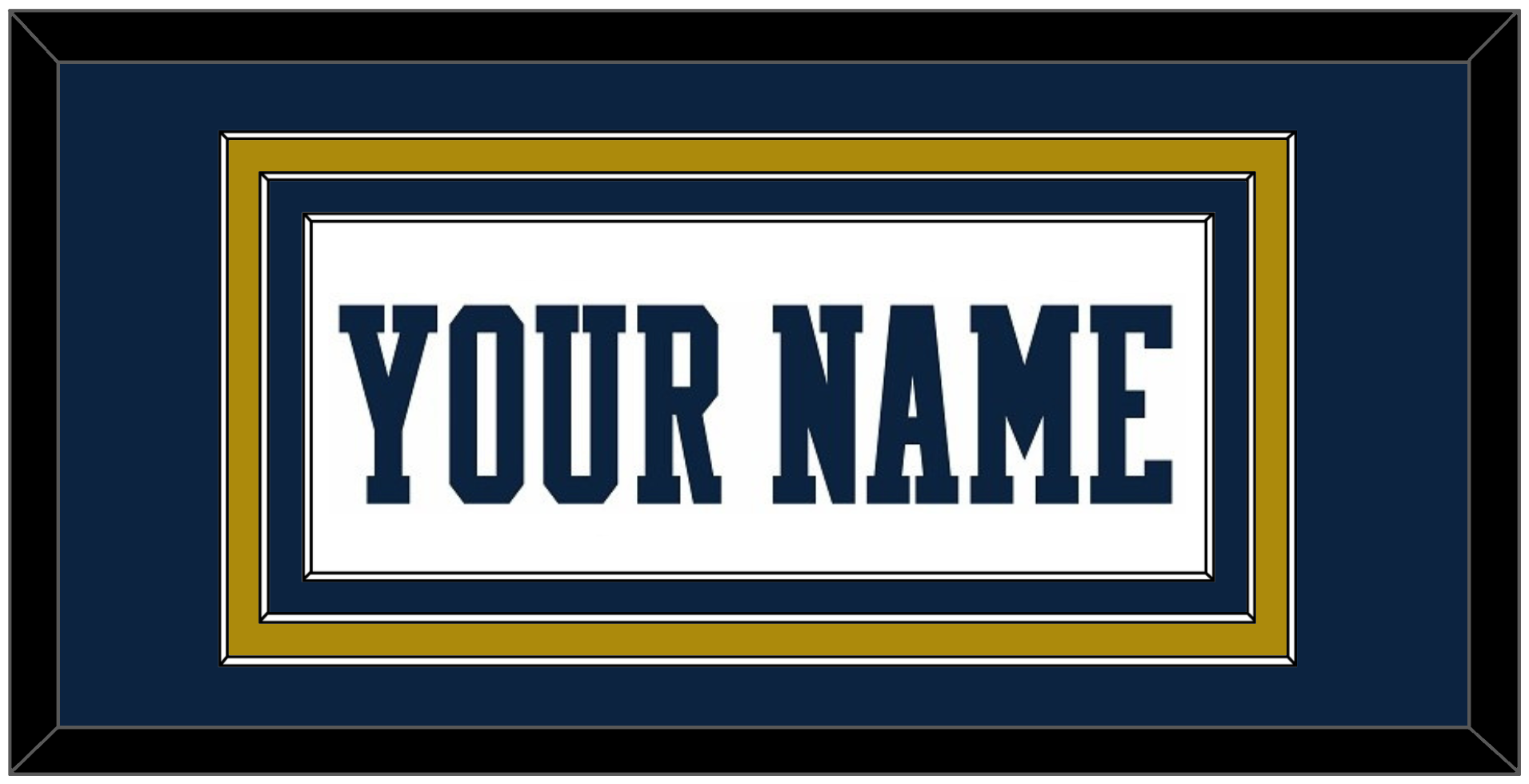 Notre Dame Basketball Home White Jersey Name. Triple Mat: Blue Mat Over A Gold Mat Over A Blue Mat. Blue Name Mounted On A White Mat. White Or Black Frame.