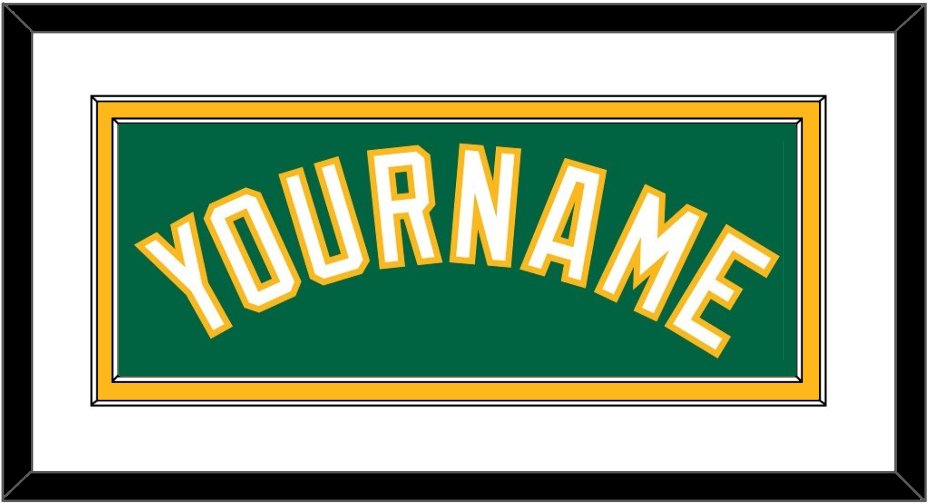 Oakland Alternate Kelly Green Jersey Name. Double Mat: White Mat Over A Yellow Mat. White Name Mounted On Green Mat. Black Frame.