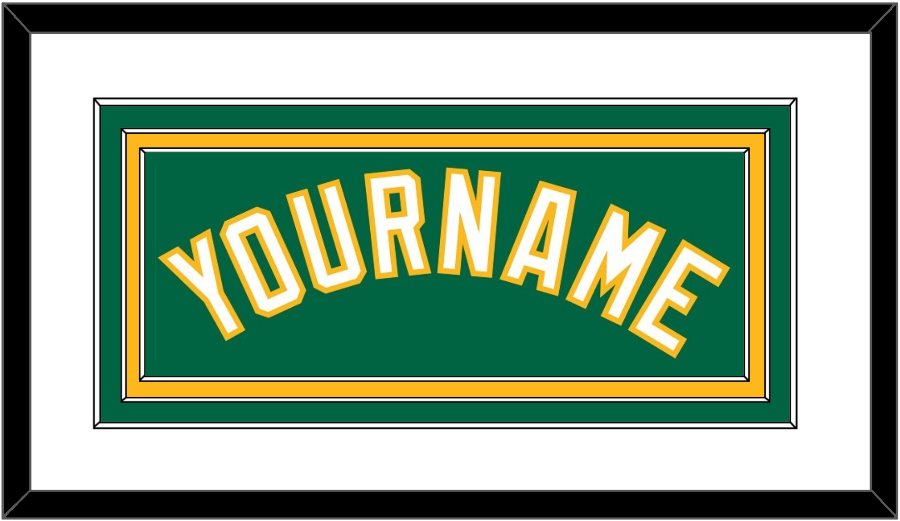 Oakland Alternate Kelly Green Jersey Name. Triple Mat: White Mat Over A Green Mat Over A Yellow Mat. White Name Mounted On Green Mat. Black Frame.