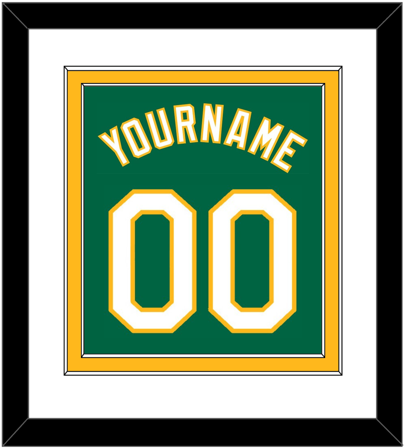 Oakland Alternate Kelly Green Jersey Name & Number. White Mat Over A Yellow Mat. White Name And Number Mounted On Green Mat. Black Frame.