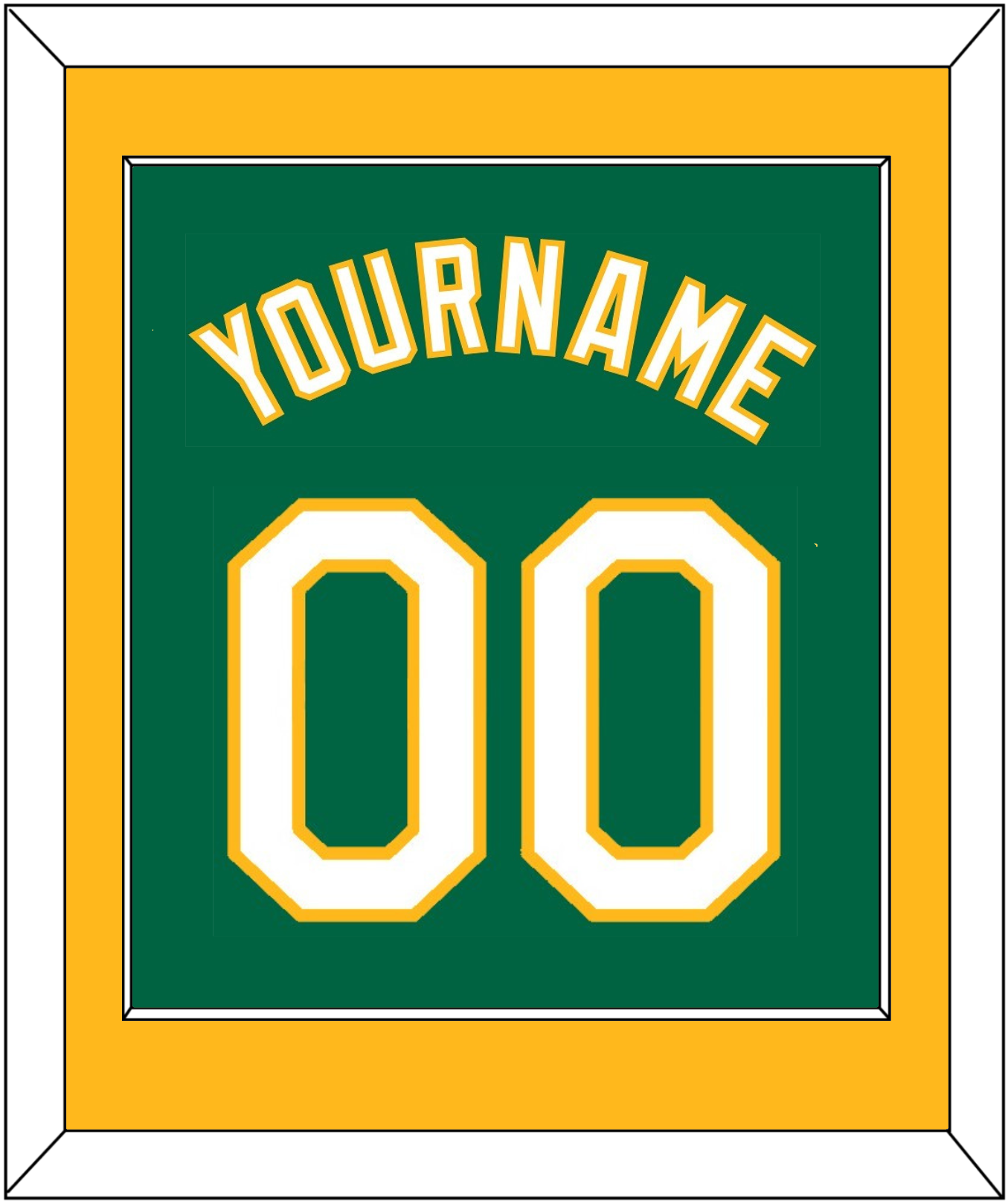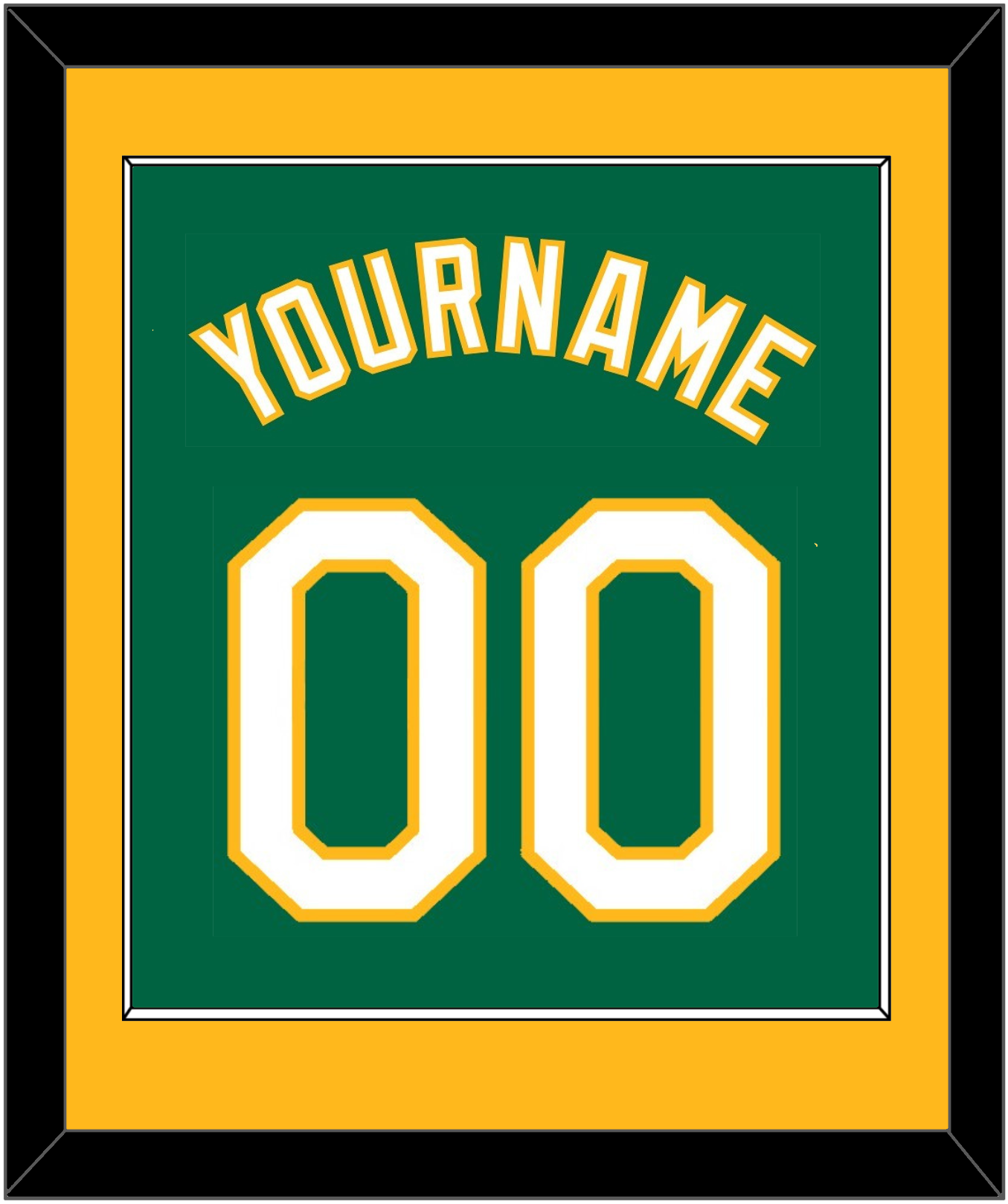 Oakland Alternate Kelly Green Jersey Name & Number. Yellow Mat With White Name And Number Mounted On Green Mat. White Or Black Frame.