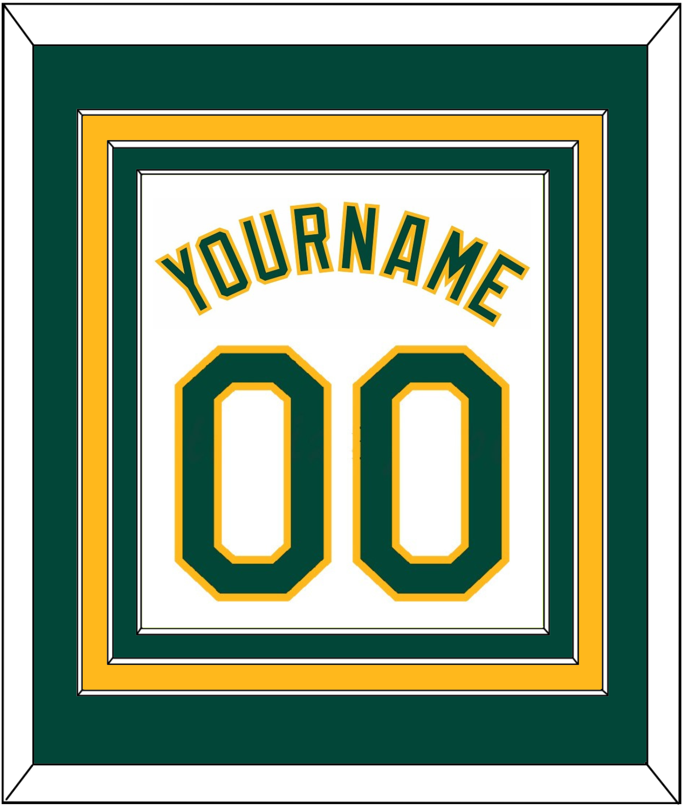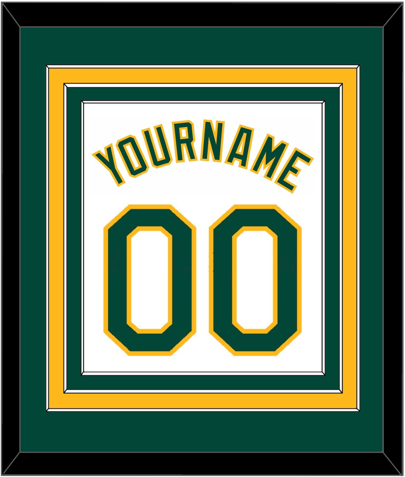 Oakland Home White Jersey Name & Number. Green Mat Over A Gold Mat Over A Green Mat. Green Name And Number Mounted On White Mat. White Or Black Frame.
