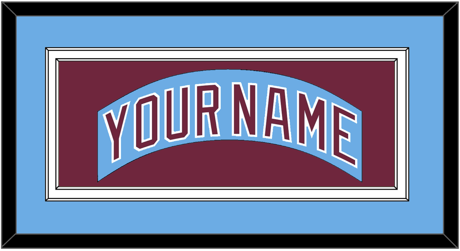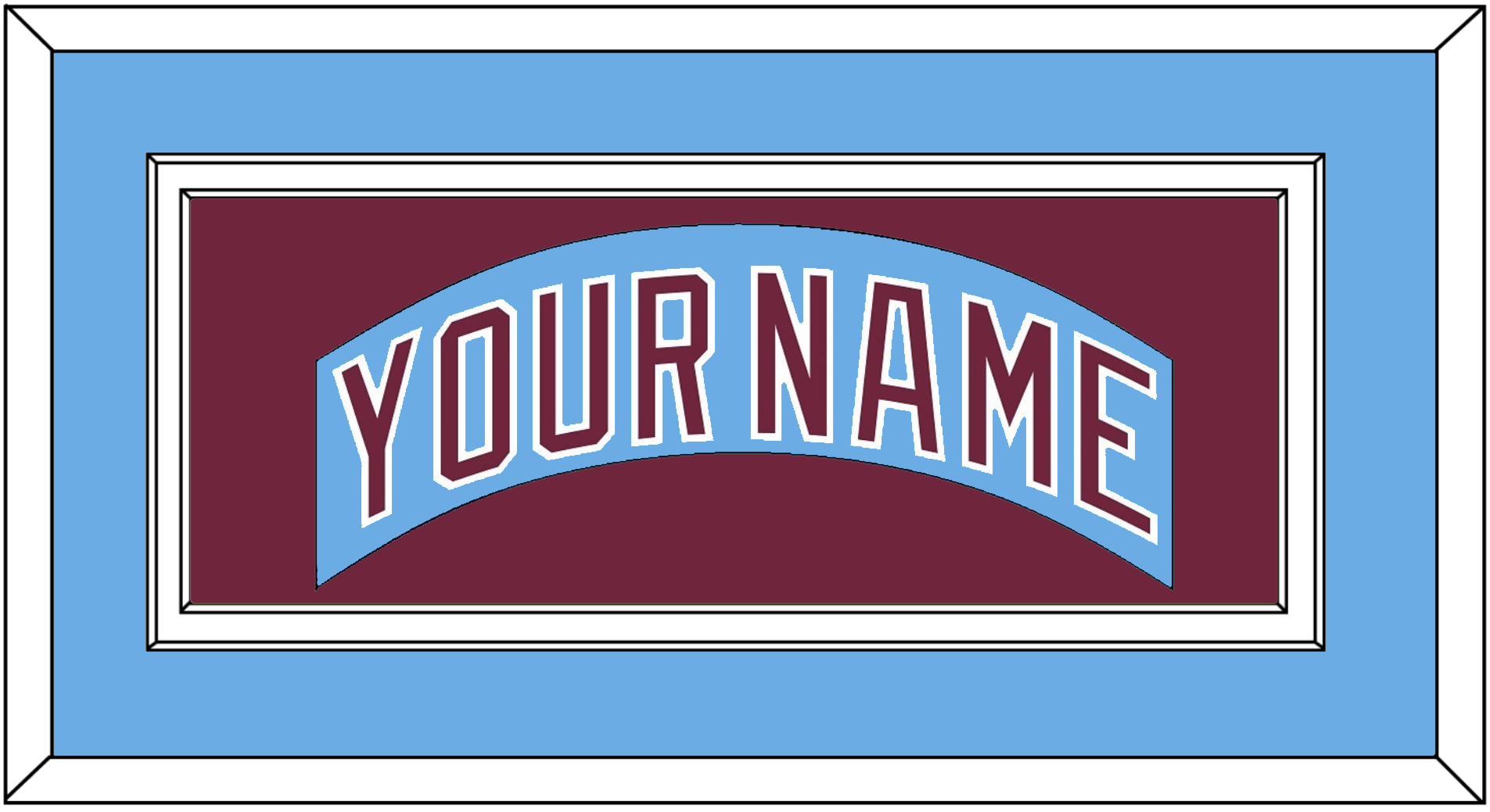 Philadelphia Road Powder Blue Jersey (1973 Through 1986) Nameplate. Double Mat: Powder Blue Mat Over A White Mat, Powder Blue Nameplate Mounted On Maroon Mat. White Or Black Frame.