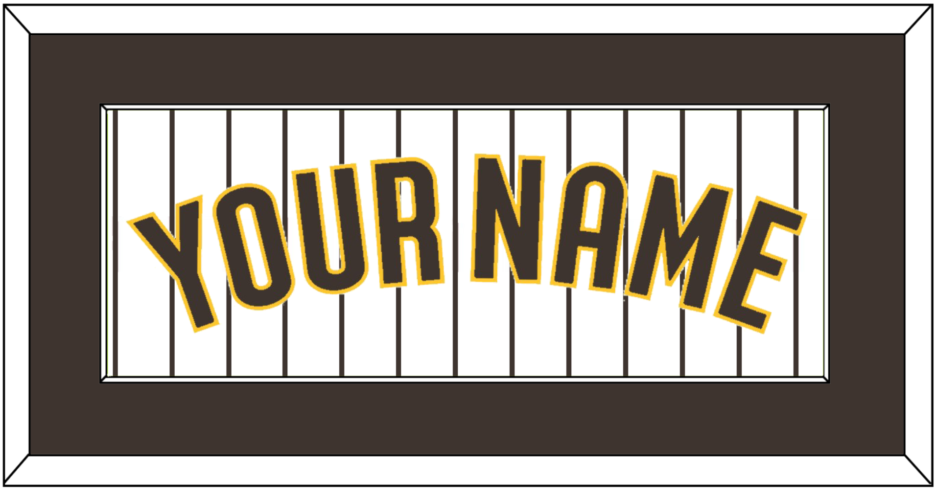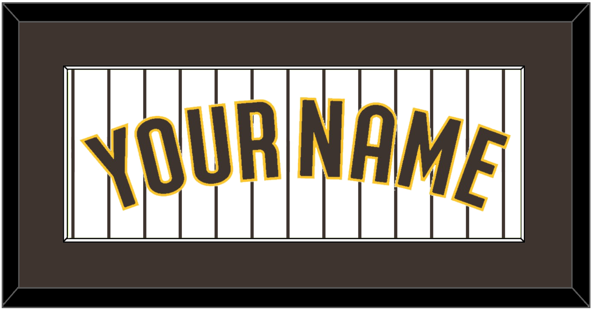San Diego Home White Pinstripes Jersey Name. Single Mat: Brown Mat With Brown Name Mounted On A Pinstripe Background. White or Black Frame.
