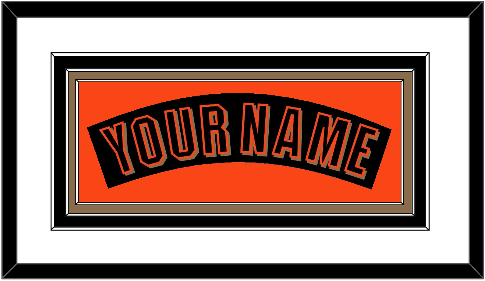 San Francisco Alternate Black Jersey (2001 Through 2002) Nameplate. Triple Mat: White Mat Over A Black Mat Over A Gold Mat. Black Nameplate Mounted On An Orange Mat. Black Frame.