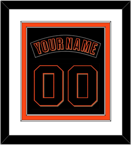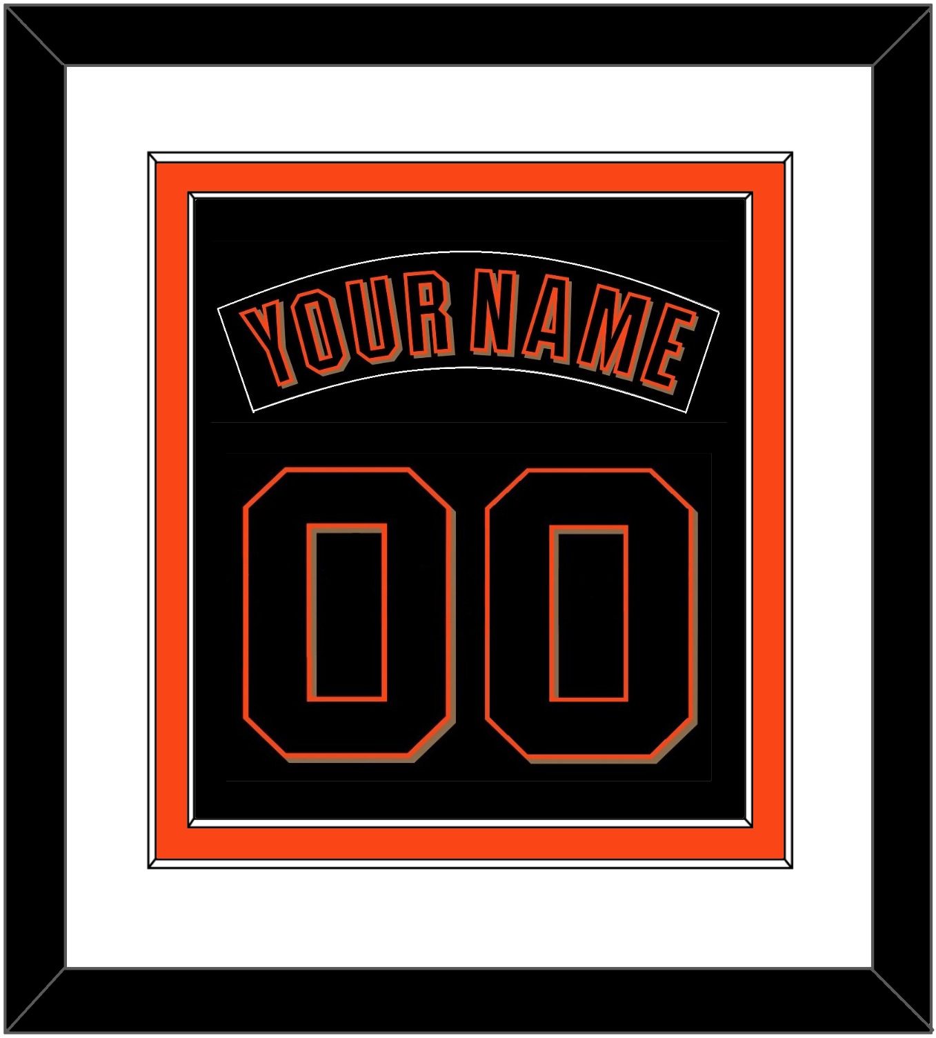 San Francisco Alternate Black Jersey (2001 Through 2002) Nameplate & Number (From The Back Of The Jersey). Double Mat Cut: White Mat Over An Orange Mat. Black Nameplate And Black Number Mounted On A Black Mat. Black Frame.