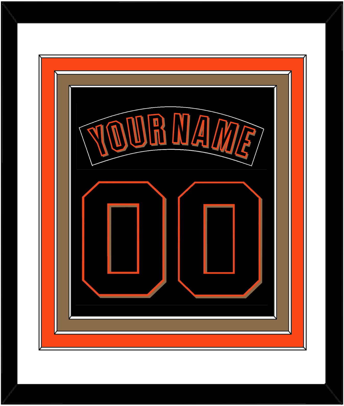 San Francisco Alternate Black Jersey (2001 Through 2002) Nameplate & Number (From The Back Of The Jersey). Triple Mat Cut: White Mat Over An Orange Mat Over A Gold Mat. Black Nameplate And Black Number Mounted On A Black Mat. Black Frame.
