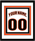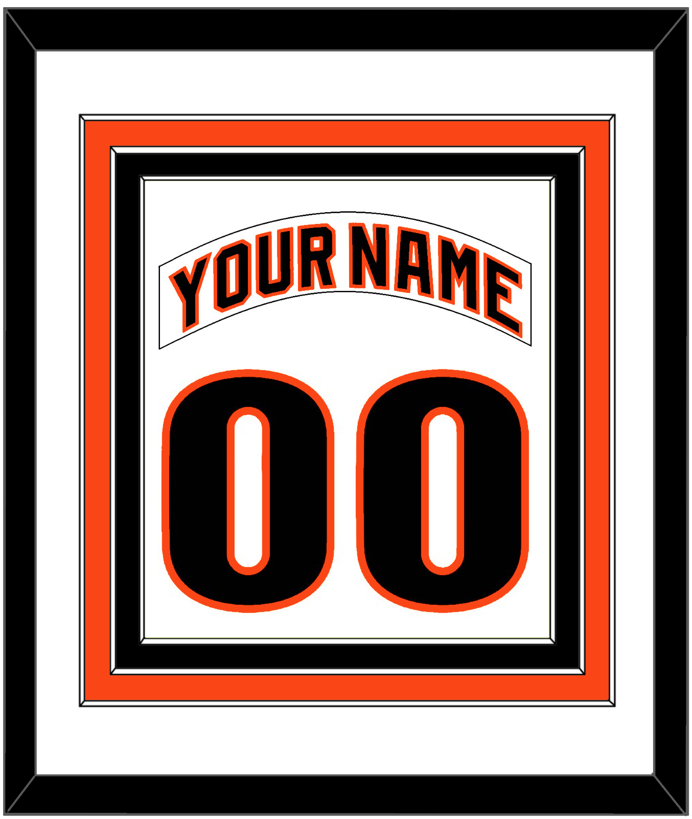 San Francisco Home White Jersey (1983 Through 1993) Nameplate & Number (From The Back Of The Jersey). Triple Mat Cut: White Mat Over An Orange Over A Black Mat. White Nameplate And Black Number Mounted On A White Mat. Black Frame.