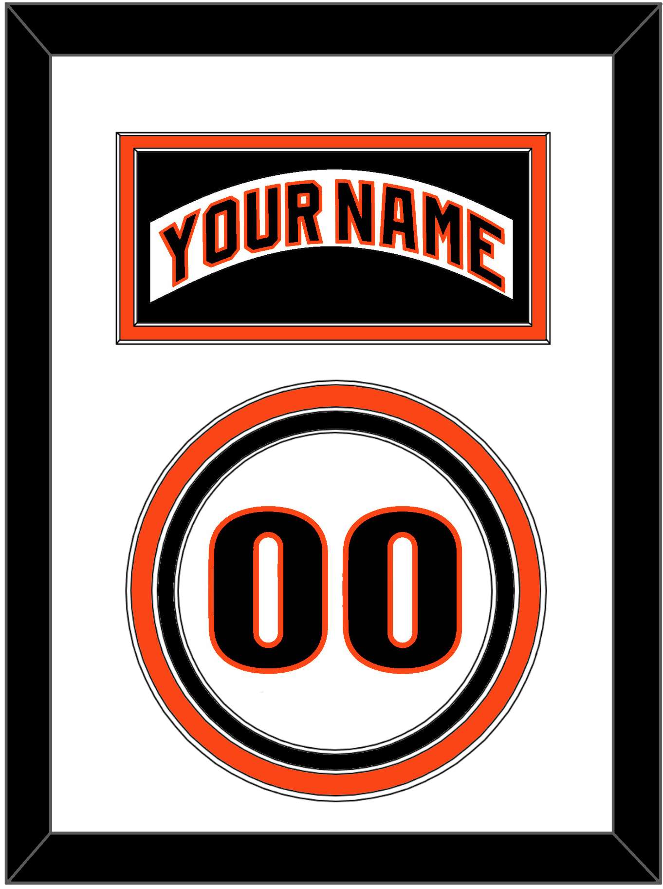 San Francisco Home White Jersey (1983 Through 1993) Nameplate & Number. Nameplate Is Double Mat Cut: White Mat Over An Orange Mat. White Nameplate Mounted On A Black Mat. To Match The Jersey, Number Is Triple Mat Cut: White Mat Over An Orange Mat Over A Black Mat, Black Number Mounted On A White Mat. Black Frame.