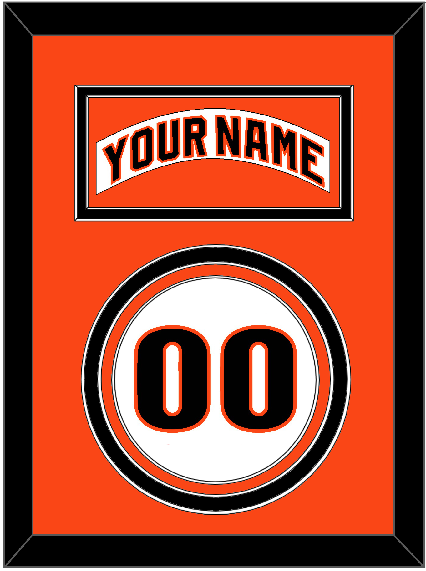 San Francisco Home White Jersey (1983 Through 1993) Nameplate & Number. Nameplate Is Double Mat Cut: Orange Mat Over A Black Mat. White Nameplate Mounted On An Orange Mat. To Match The Jersey, Number Is Triple Mat Cut: Orange Mat Over A Black Mat Over An Orange Mat, Black Number Mounted On A White Mat. Black Frame.