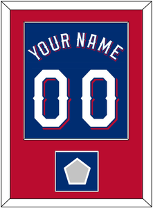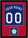 Texas Alternate Blue Jersey (2020 Through 2023) Name & Number With 2023 World Series Champions Patch. Red Mat With Name, Number & Patch Mounted On A Blue Mat. White Or Black Frame.