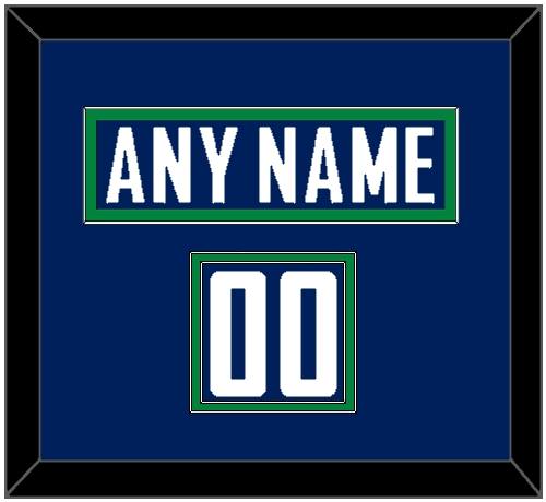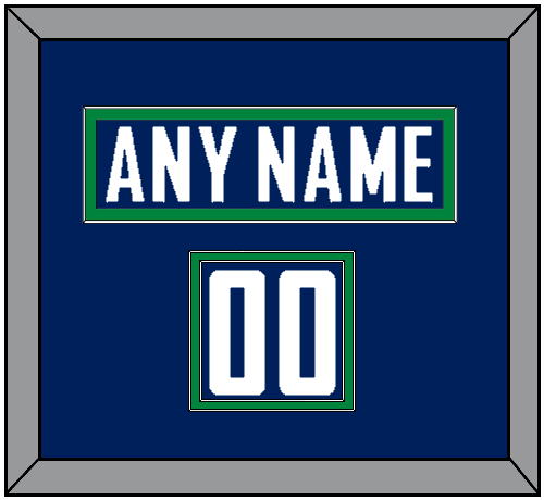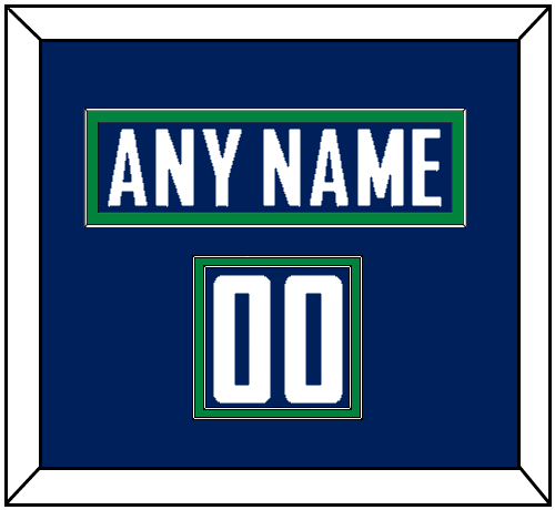 Vancouver Home Blue Jersey Nameplate & Numbers From Shoulder - The Nameplate Is Single Mat Cut:  Blue Nameplate Mounted On Green  Mat.  To Match The Jersey, The Numbers Are Double Mat Cut:  Blue Mat Over A Green Mat White Numbers Mounted On A Blue Mat.  White, Black Or Silver Frame.