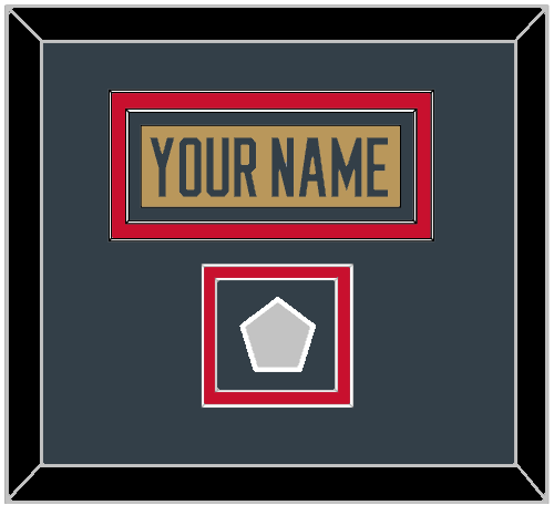 Vegas Alternate Gold Jersey Nameplate With A 2023 Stanley Cup Champions Patch.  Double Mat Cut:  Steel Gray Mat Over A Red Mat.  Gold Nameplate And Patch Mounted On A Steel Gold Mat.  White Or Black Frame.