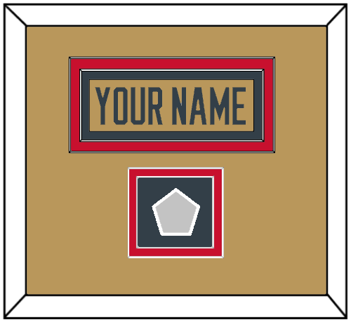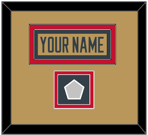 Vegas Alternate Gold Jersey Nameplate With A 2023 Stanley Cup Champions Patch.  Double Mat Cut:  Gold Mat Over A Red Mat.  Gold Nameplate And Patch Mounted On A Steel Gold Mat.  Black Or White Frame.
