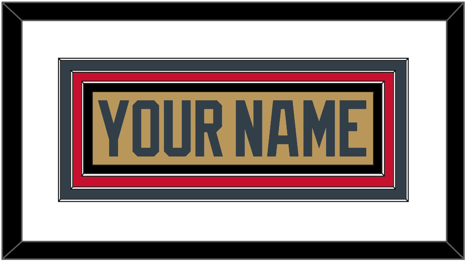 Vegas Alternate Gold Jersey Nameplate.  Triple Mat:  White Mat Over A Steel Gray Mat Over A Red Mat, Gold Nameplate Mounted On Black Mat.  Black Frame.