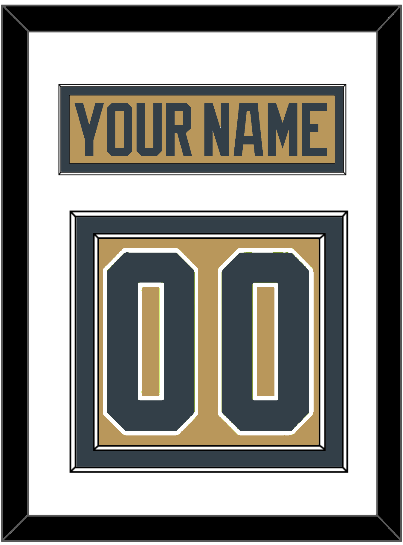 Vegas Alternate Gold Jersey Nameplate & Numbers (From The Back Of The Jersey). Nameplate Is Single Mat Cut: White Mat With Gold Nameplate Mounted On A Steel Gray Mat. To Match The Jersey, Number Is Double Mat Cut: White Mat Over A Steel Gray Mat, Steel Gray Number Mounted On A Gold Mat. Black Frame.