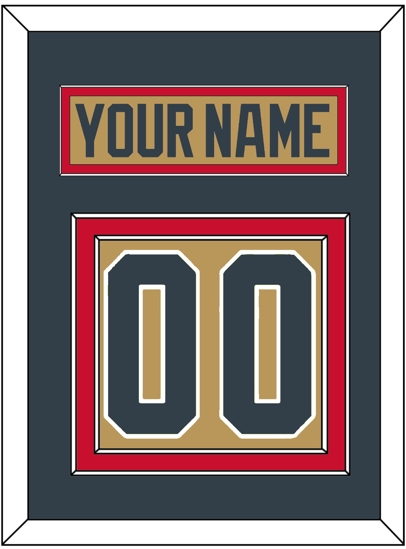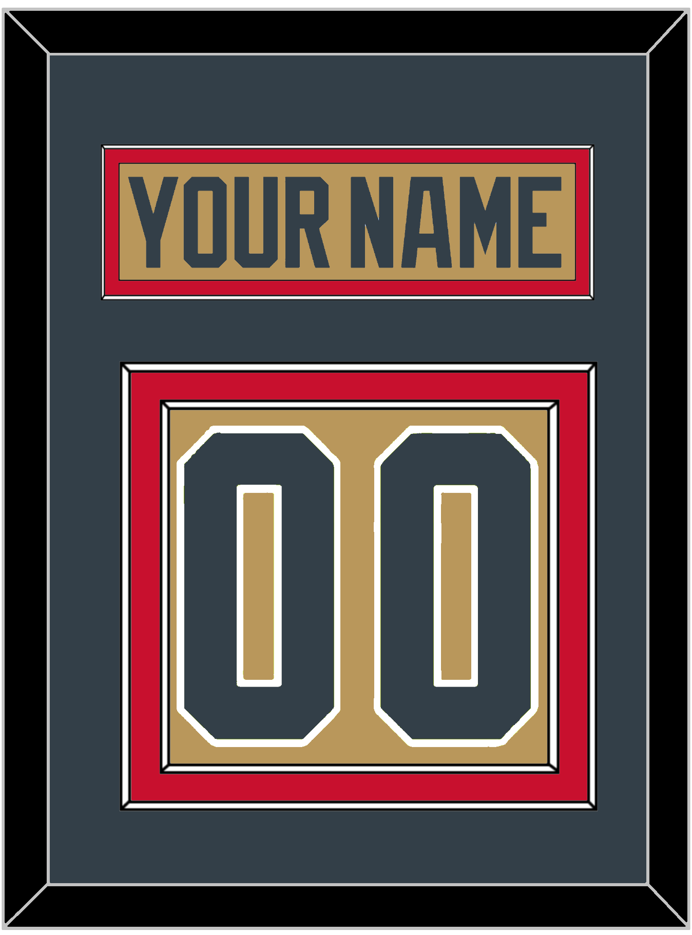 Vegas Alternate Gold Jersey Nameplate & Numbers (From The Back Of The Jersey). Nameplate Is Single Mat Cut: Steel Gray Mat With Gold Nameplate Mounted On A Red Mat. To Match The Jersey, Number Is Double Mat Cut: Steel Gray Mat Over A Red Mat, Steel Gray Number Mounted On A Gold Mat. Black Or White Frame.