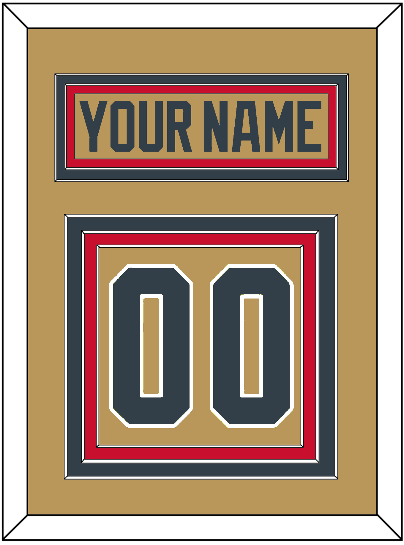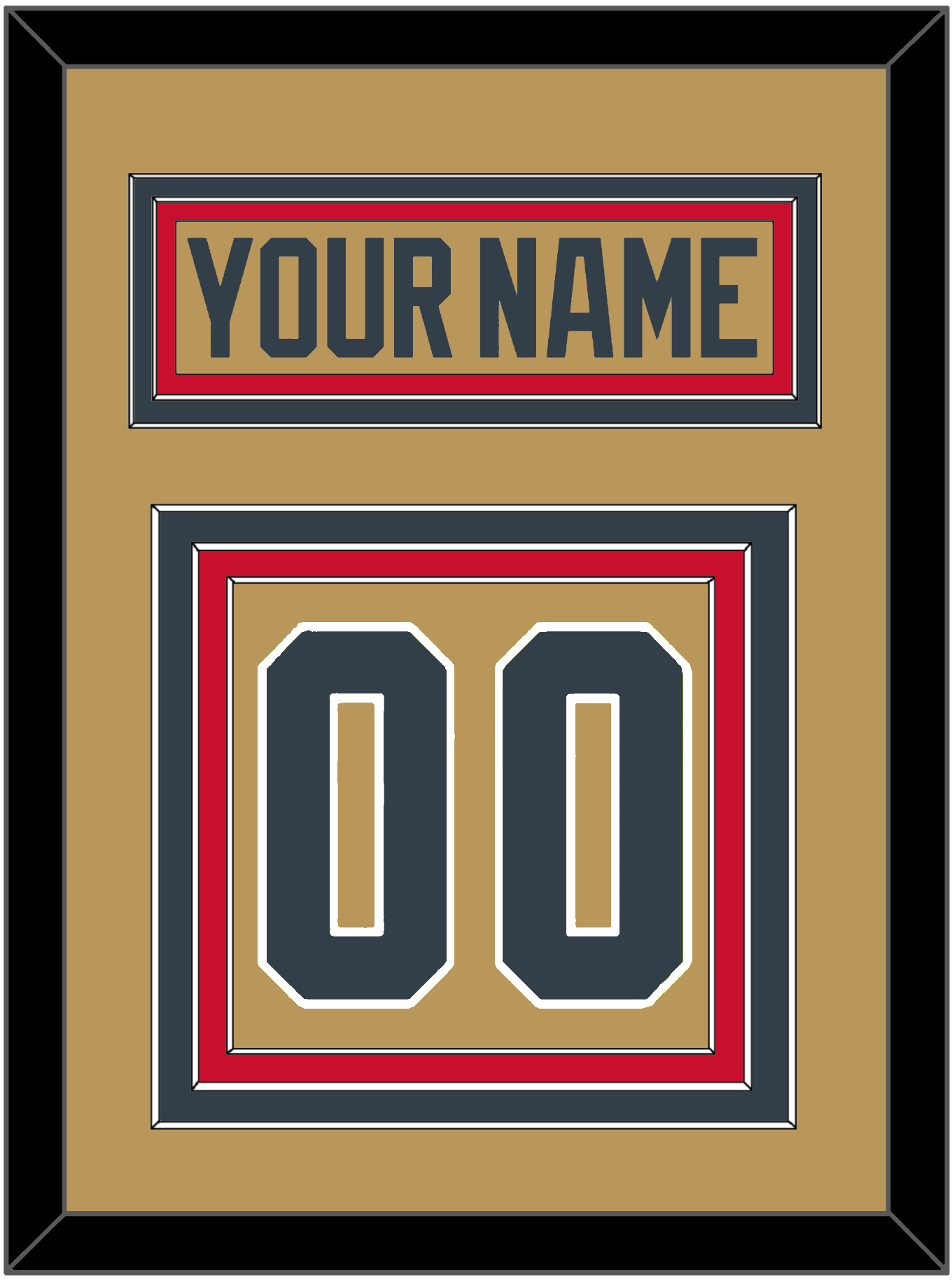 Vegas Alternate Gold Jersey Nameplate & Numbers (From The Back Of The Jersey). Nameplate Is Double Mat Cut: Gold Mat Over A Steel Gray Mat. Gold Nameplate Mounted On A Red Mat. To Match The Jersey, Number Is Triple Mat Cut: Gold Mat Over A Steel Gray Mat Over A Red Mat, Steel Gray Number Mounted On A Gold Mat. Black Or White Frame.