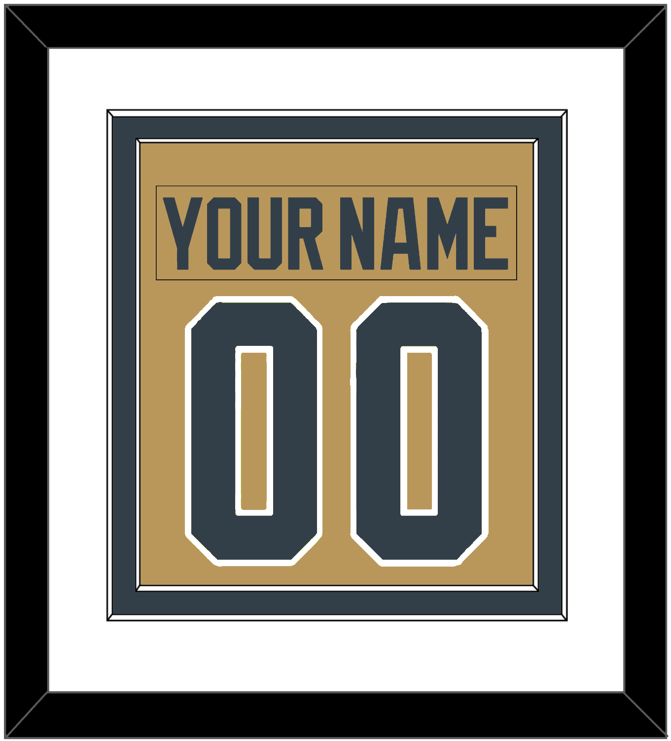 Vegas Alternate Gold Jersey Nameplate & Number (From The Back Of The Jersey). Double Mat Cut: White Mat Over A Steel Gray Mat. Gold Nameplate And Steel Gray Number Mounted On A Gold Mat. Black Frame.