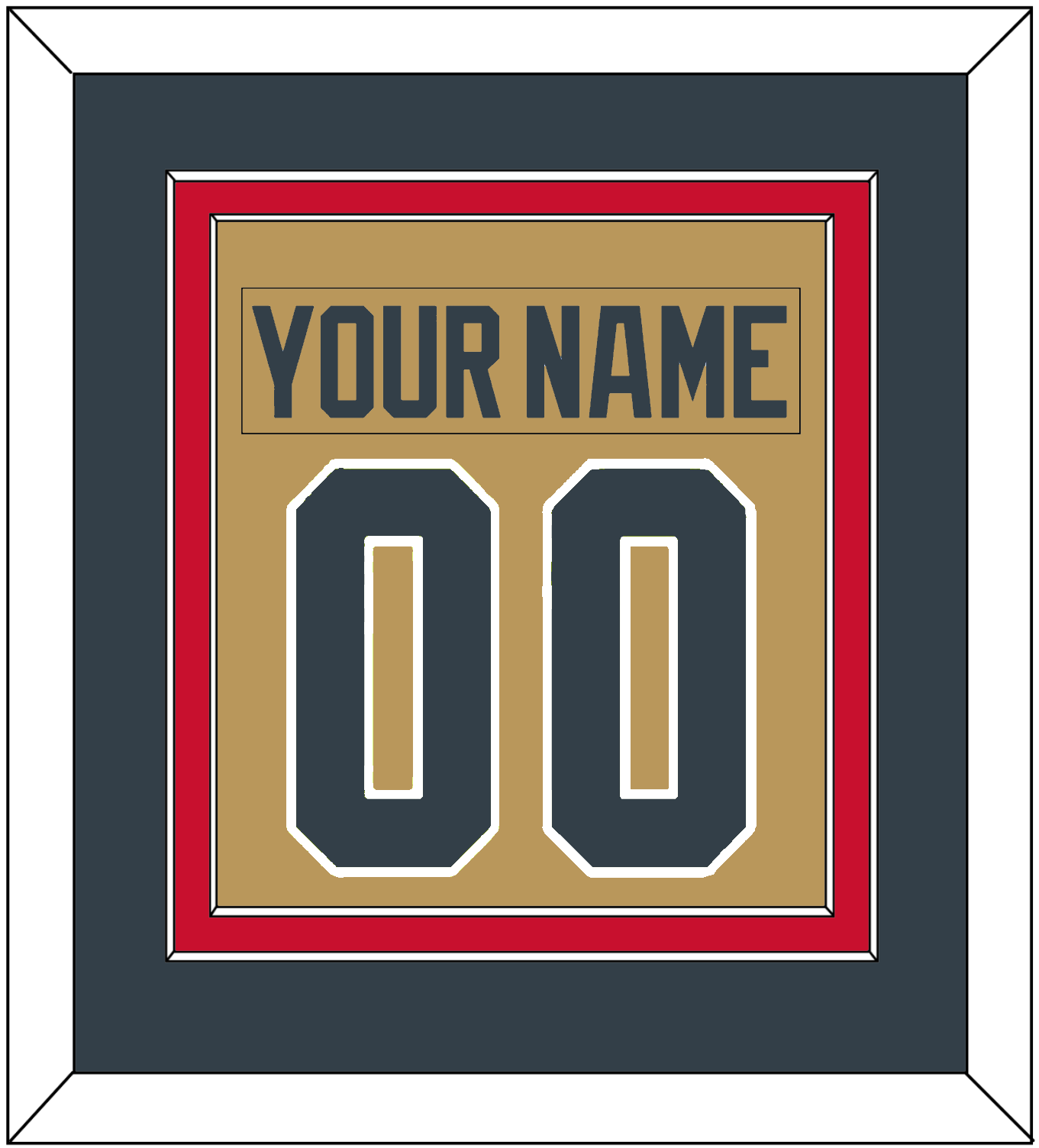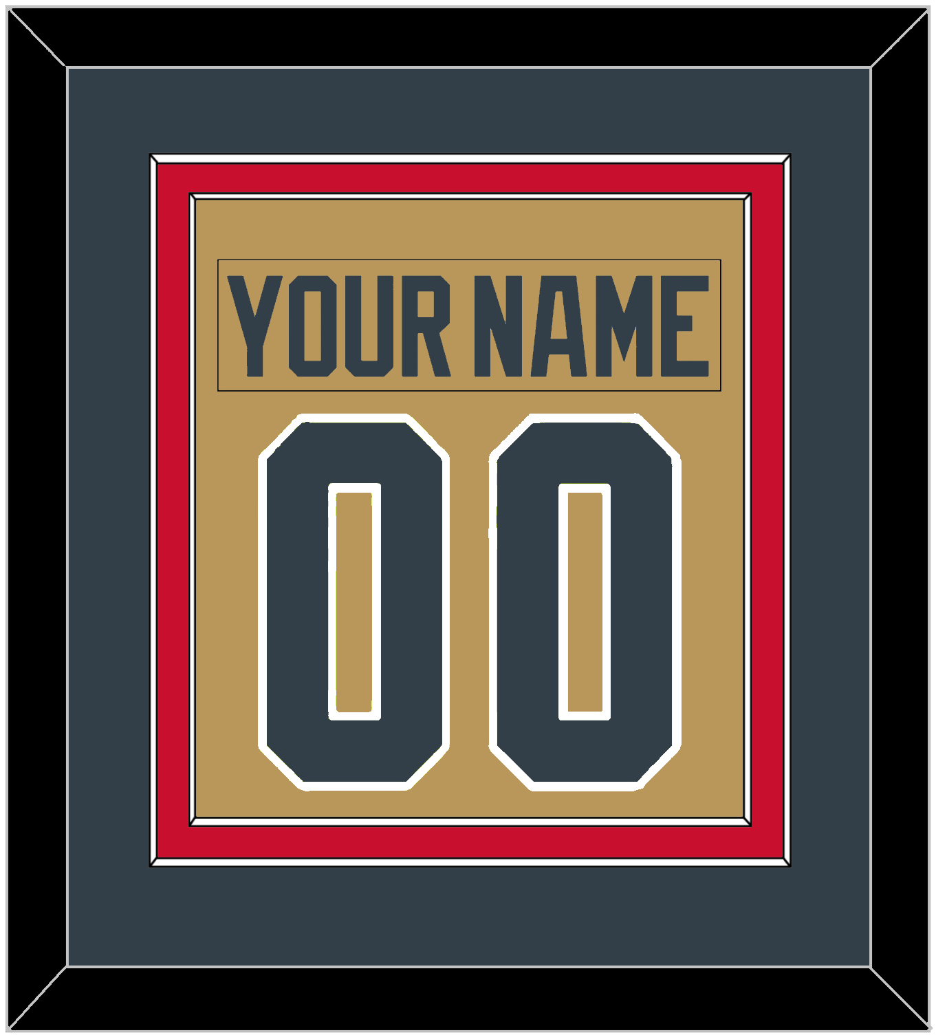 Vegas Alternate Gold Jersey Nameplate & Number (From The Back Of The Jersey). Double Mat Cut: Steel Gray Mat Over A Red Mat. Gold Nameplate And Steel Gray Number Mounted On A Gold Mat. White Or Black Frame.