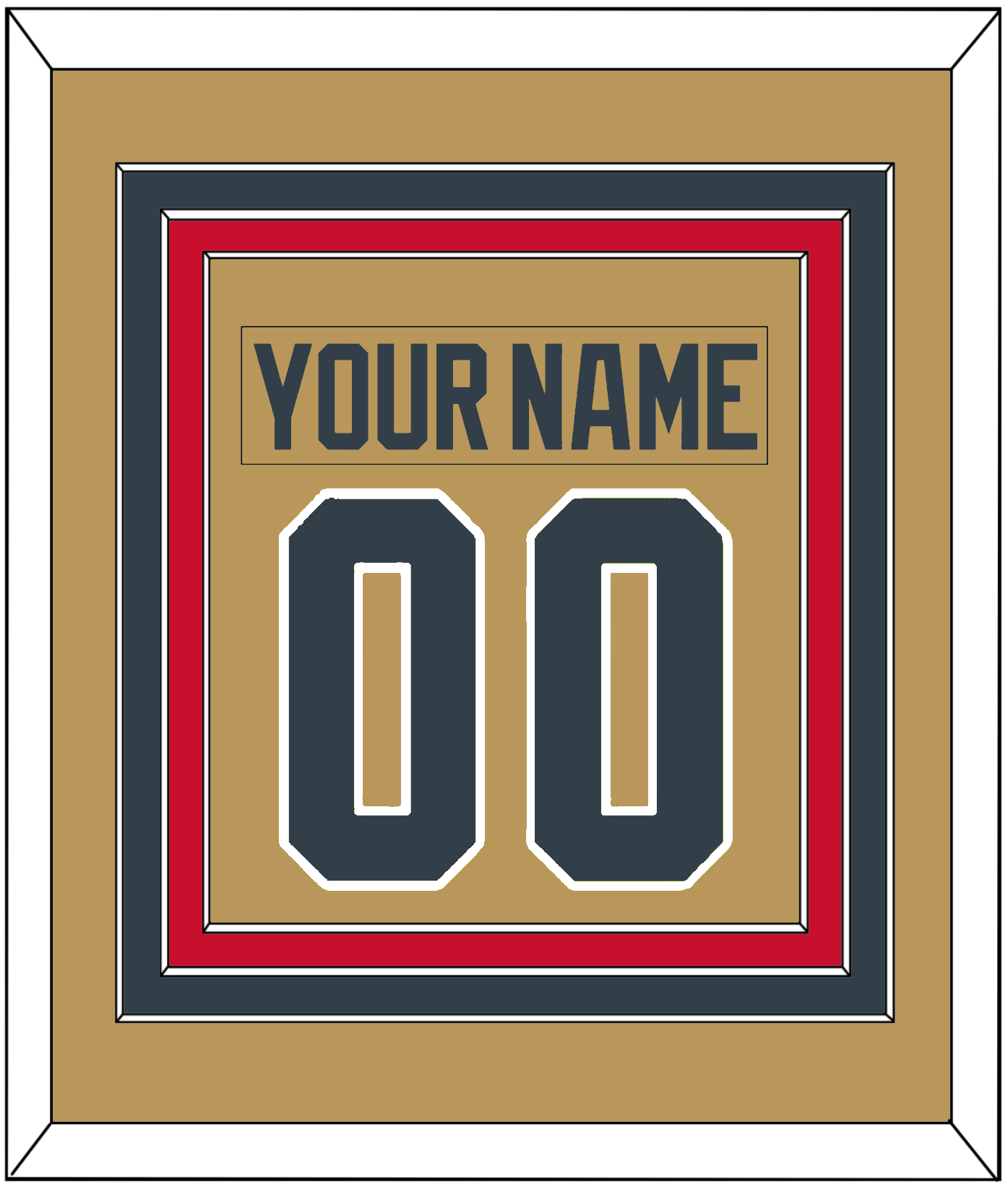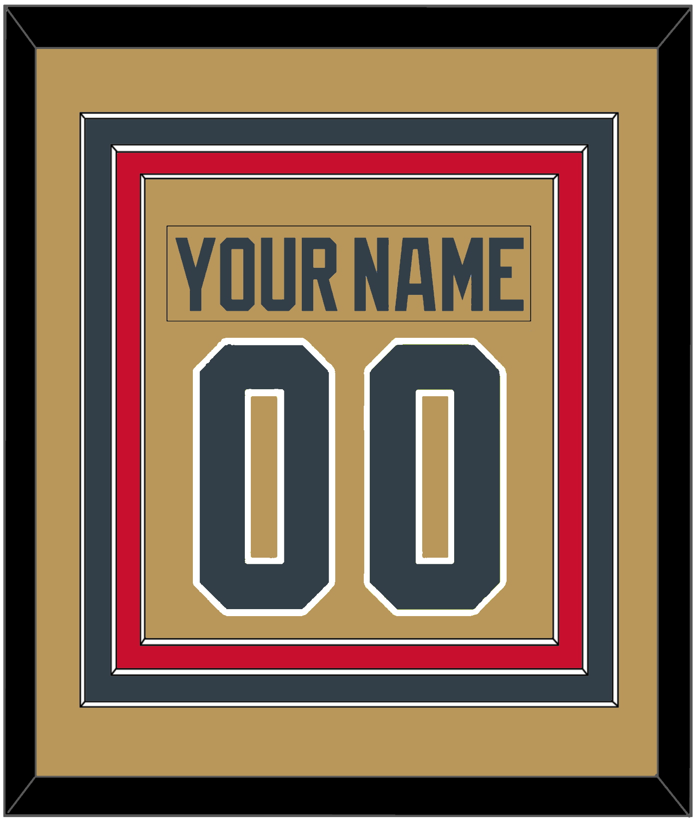 Vegas Alternate Gold Jersey Nameplate & Number (From The Back Of The Jersey). Triple Mat Cut: Gold Mat Over A Steel Gray Mat Over A Red Mat. Gold Nameplate And Steel Gray Number Mounted On A Gold Mat. Black Or White Frame.