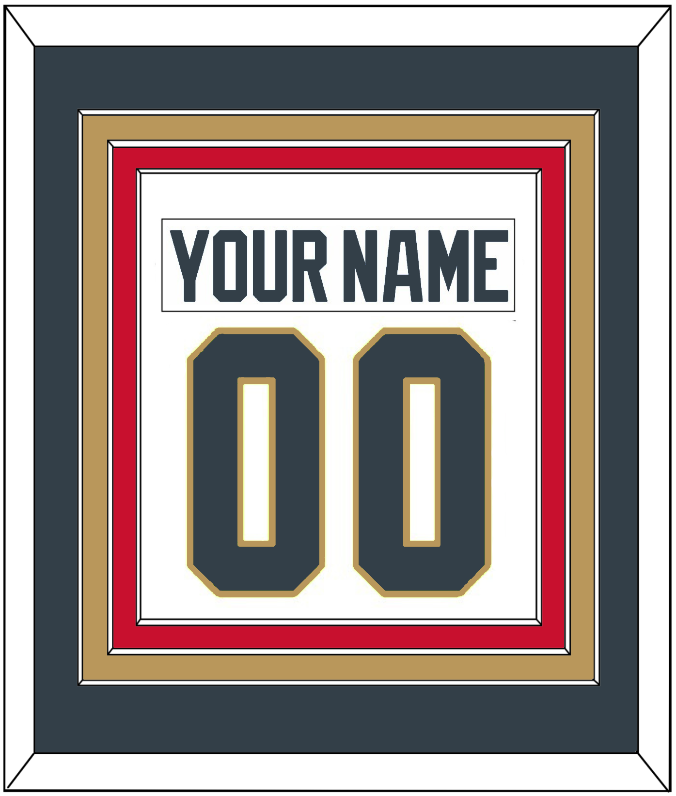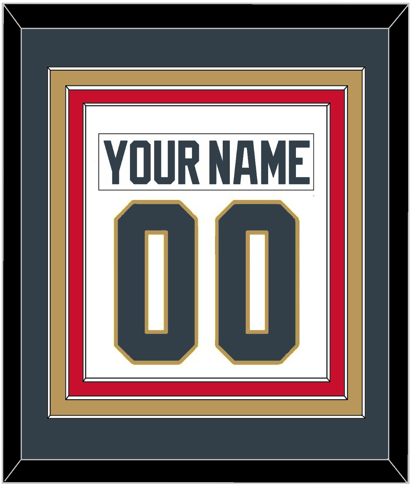 Vegas Road White Jersey Nameplate & Number (From The Back Of The Jersey). Triple Mat Cut: Steel Gray Mat Over A Gold Mat Over A Red Mat. White Nameplate And Steel Gray Number Mounted On A White Mat. White Or Black Frame.