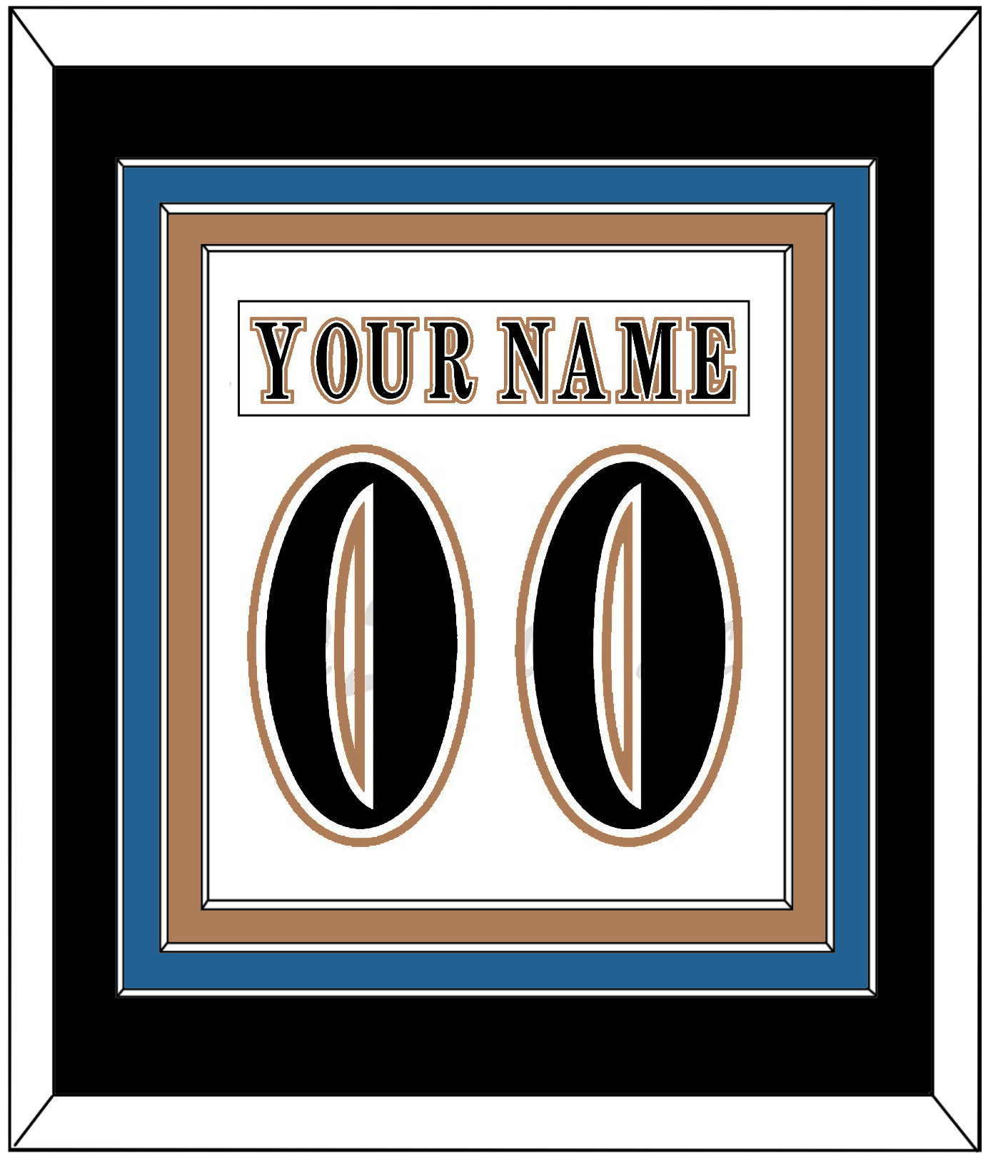 Washington Home White Jersey (1995 Through 2007) Nameplate & Number (From The Back Of The Jersey).  Triple Mat Cut:  Black Mat Over A Blue Mat Over A Bronze Mat.  White Nameplate And Black Number Mounted On A White Mat.  White Frame.