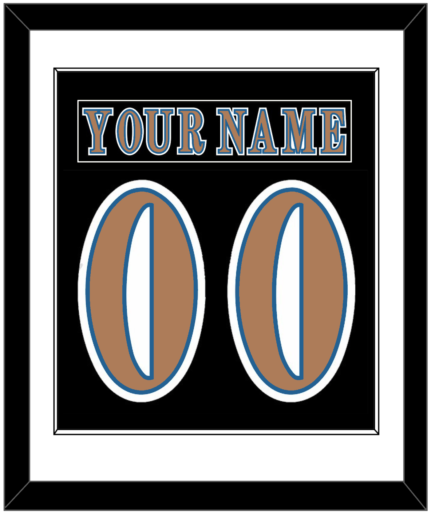 Washington Road Black Jersey (1997 Through 2007) Nameplate & Number (From The Back Of The Jersey). Single Mat Cut: White Mat With Black Nameplate And Bronze Number Mounted On A White Mat. Black Frame.