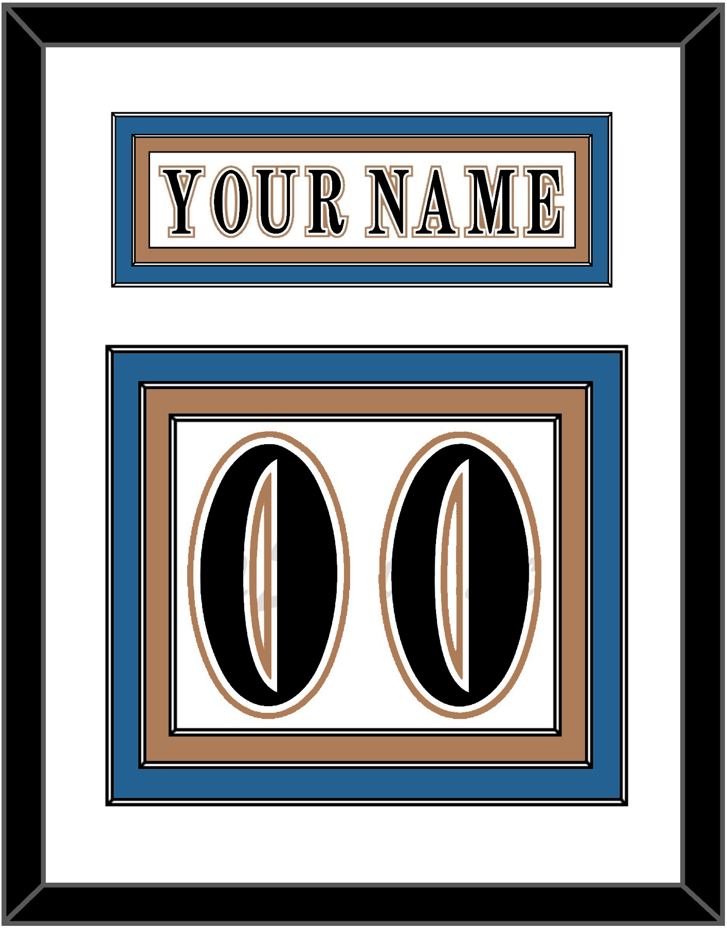 Washington Home White Jersey (1995 Through 2007) Nameplate & Numbers (From The Back Of The Jersey). Nameplate Is Double Mat Cut: White Mat Over A Blue Mat. White Nameplate Mounted On A Bronze Mat. To Match The Jersey, Number Is Triple Mat Cut: White Mat Over A Blue Mat Over A Bronze Mat. Black Number Mounted On A White Mat. Black Frame.