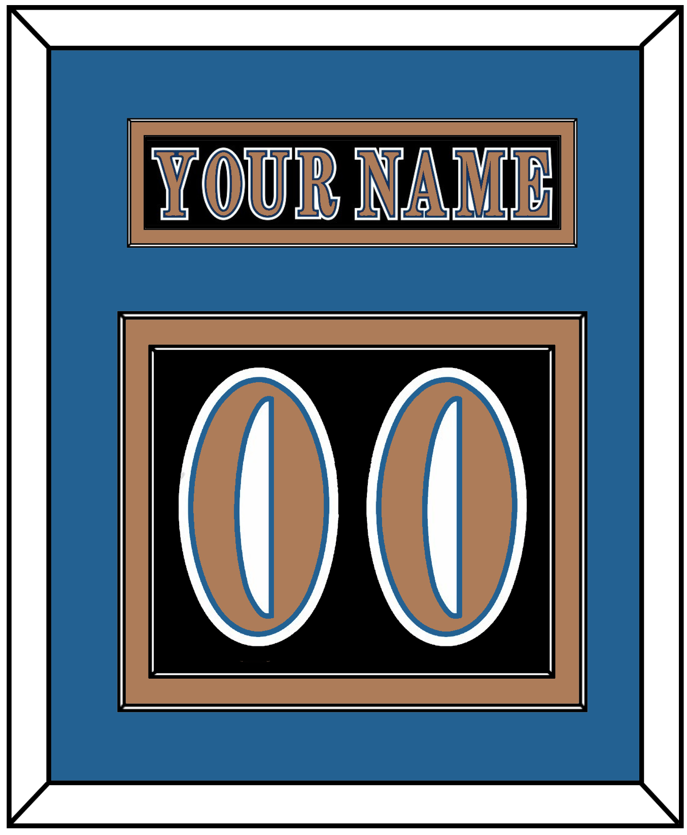 Washington Road Black Jersey (1997 Through 2007) Nameplate & Numbers (From The Back Of The Jersey). Nameplate Is Single Mat Cut: Blue Mat With Black Nameplate Mounted On A Bronze Mat. To Match The Jersey, Number Is Double Mat Cut: Blue Mat Over A Bronze Mat. Bronze Number Mounted On A Black Mat. Black Or White Frame.