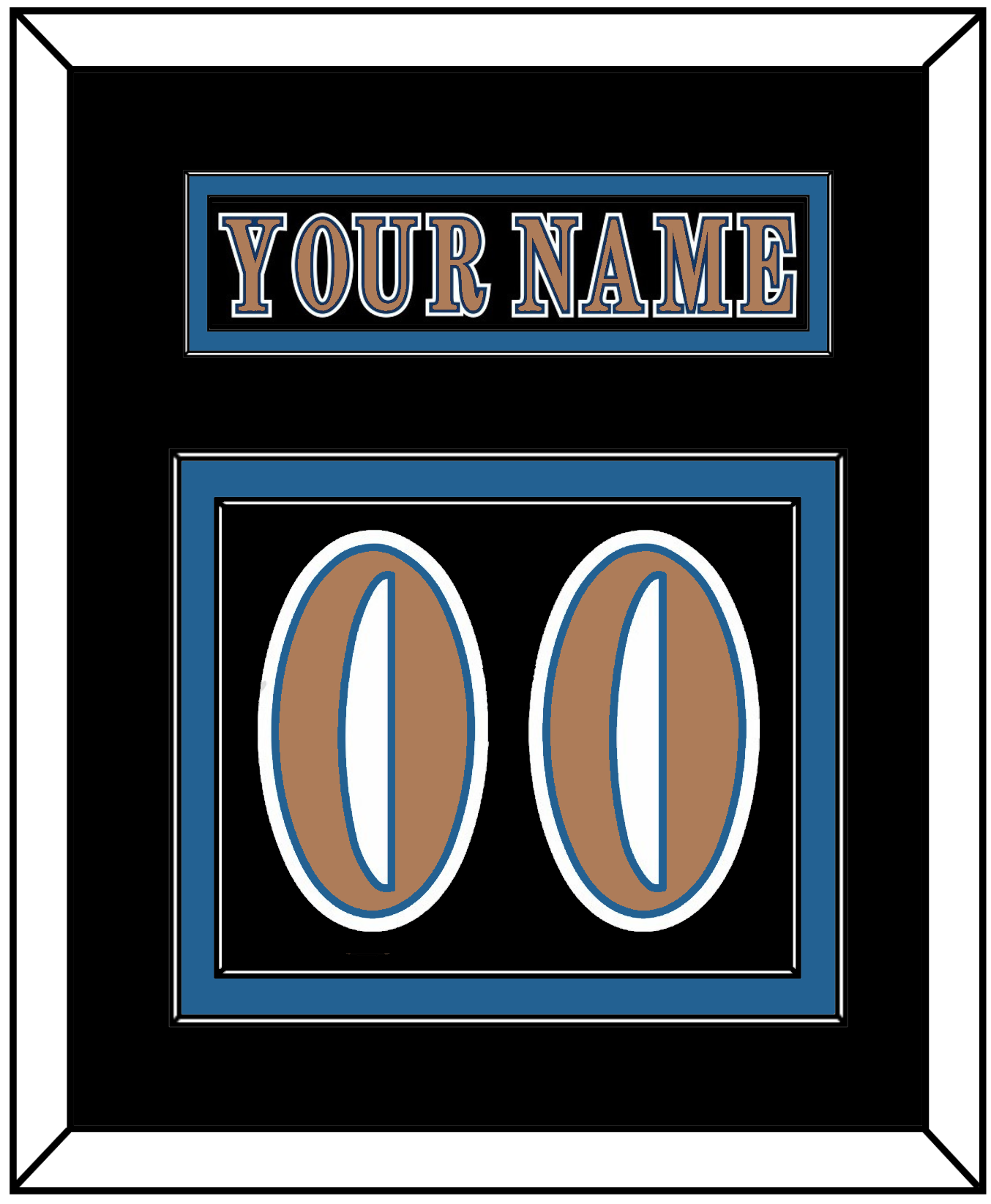 Washington Road Black Jersey (1997 Through 2007) Nameplate & Numbers (From The Back Of The Jersey). Nameplate Is Single Mat Cut: Black Mat With Black Nameplate Mounted On A Blue Mat. To Match The Jersey, Number Is Double Mat Cut: Black Mat Over A Blue Mat, Bronze Number Mounted On A Black Mat. White Frame.