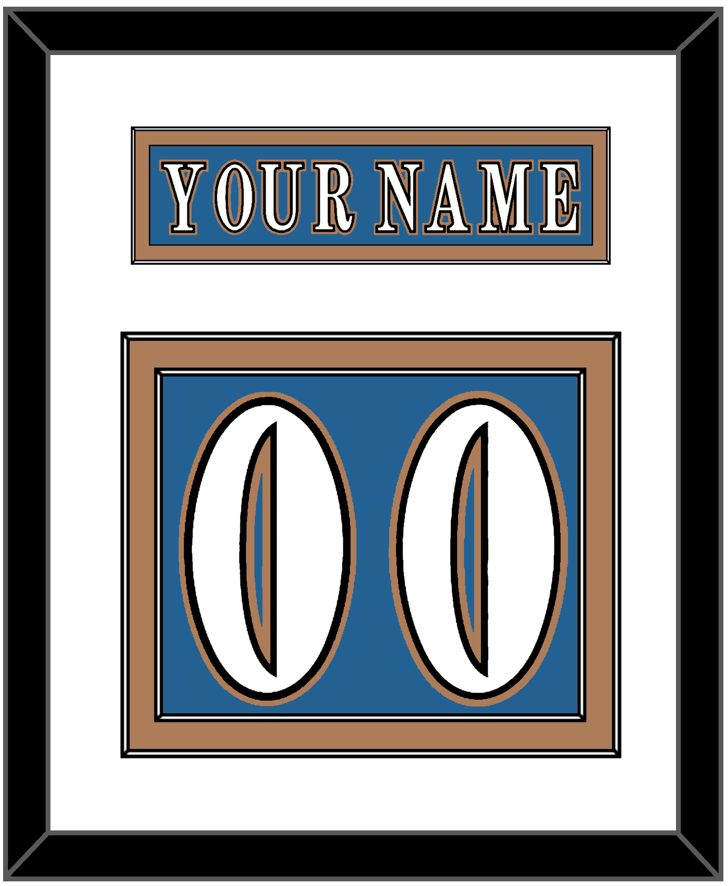 Washington Road Blue Jersey (1995 Through 2000) Nameplate & Numbers (From The Back Of The Jersey). Nameplate Is Single Mat Cut: White Mat With Blue Nameplate Mounted On A Bronze Mat. To Match The Jersey, Number Is Double Mat Cut: White Mat Over A Bronze Mat, White Number Mounted On A Blue Mat. Black Frame.