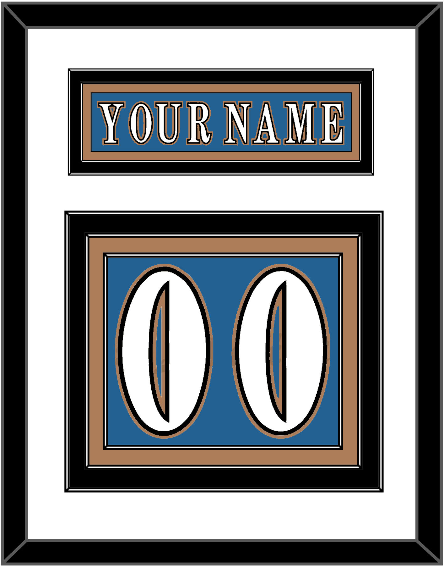 Washington Road Blue Jersey (1995 Through 2000) Nameplate & Numbers (From The Back Of The Jersey). Nameplate Is Double Mat Cut: White Mat Over A Black Mat. Blue Nameplate Mounted On A Bronze Mat. To Match The Jersey, Number Is Triple Mat Cut: White Mat Over A Black Mat Over A Bronze Mat. White Number Mounted On A Blue Mat. Black Frame.