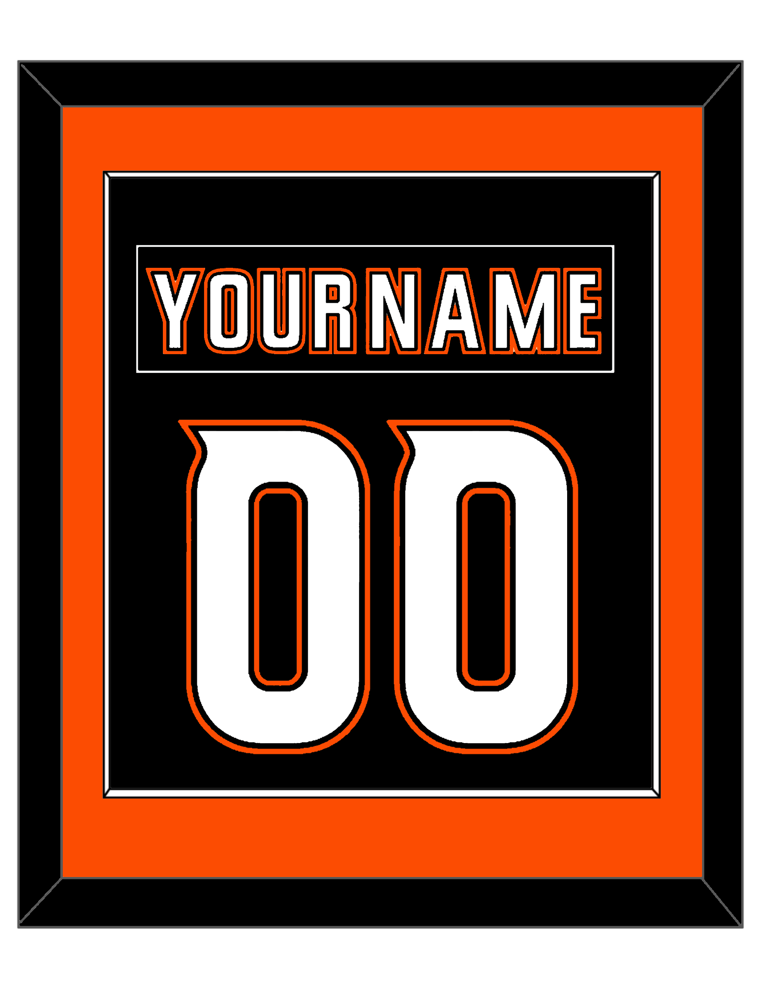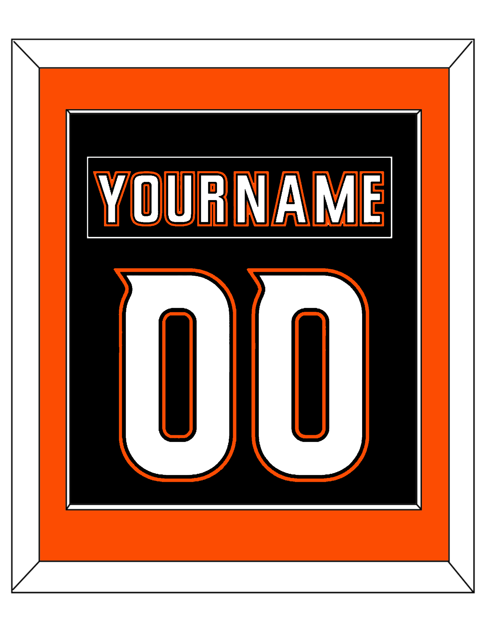 Anaheim Home Black Jersey (2014 Through 2024) Nameplate & Number (From The Back Of The Jersey). Single Mat Cut: Orange Mat With Black Nameplate And White Number Mounted On A Black Mat. Black Or White Frame.
