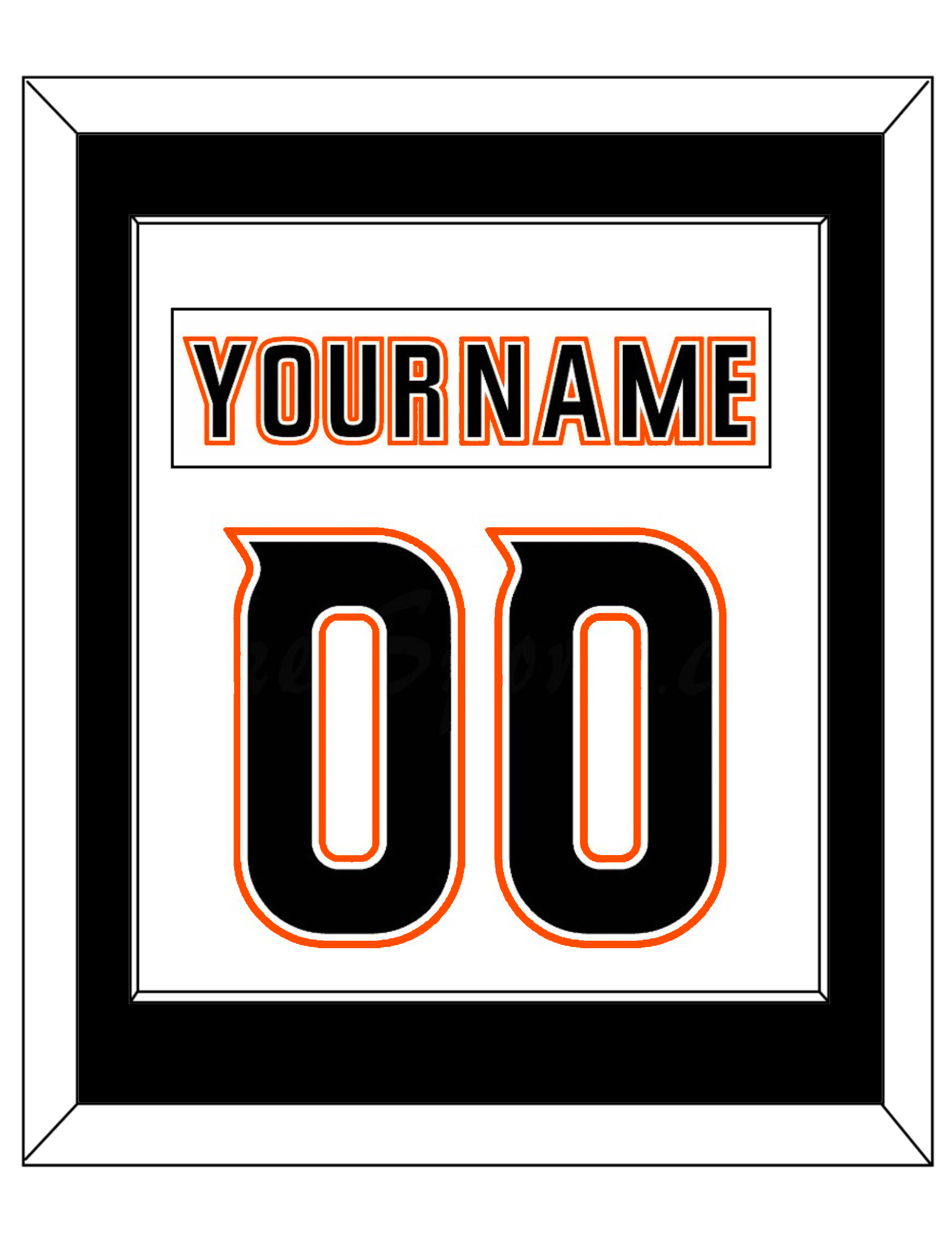 Anaheim Road White Jersey (2014 Through 2024) Nameplate & Number (From The Back Of The Jersey). Single Mat Cut: Black Mat With White Nameplate And Black Number Mounted On A White Mat. White Frame.