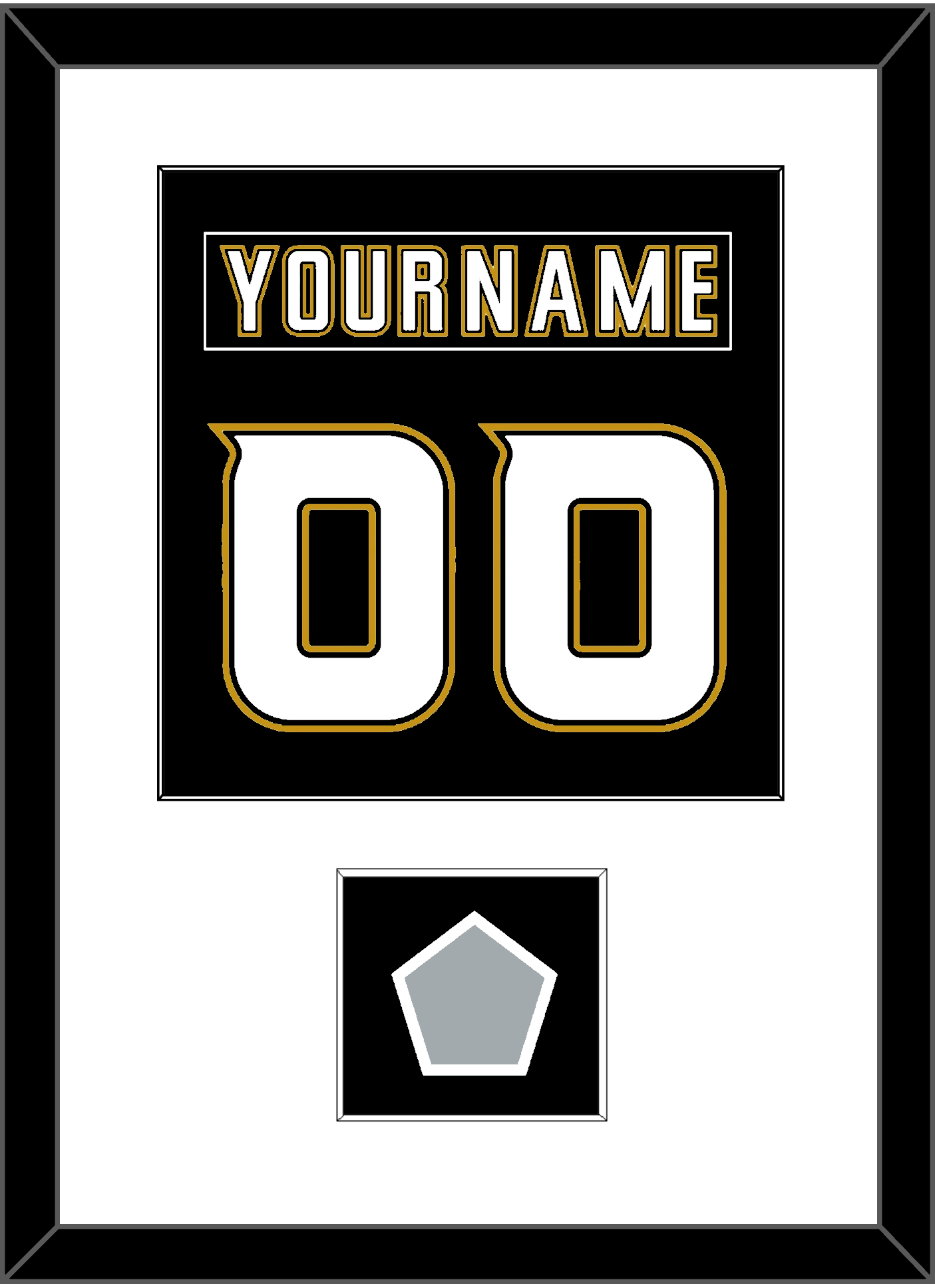 Anaheim Home Black Jersey (2006 Through 2014) Nameplate & Number (From The Back Of The Jersey) With 2007 Stanley Cup Finals Patch. Single Mat Cut: White Mat With Black Nameplate, White Number & Patch Mounted On A Black Mat. Black Frame.