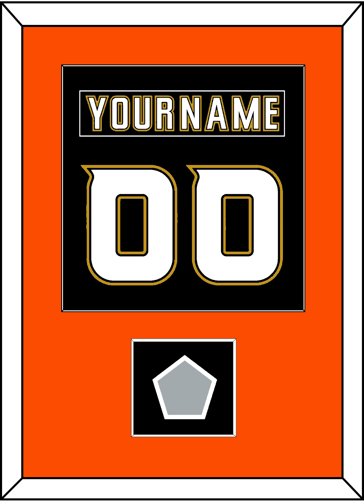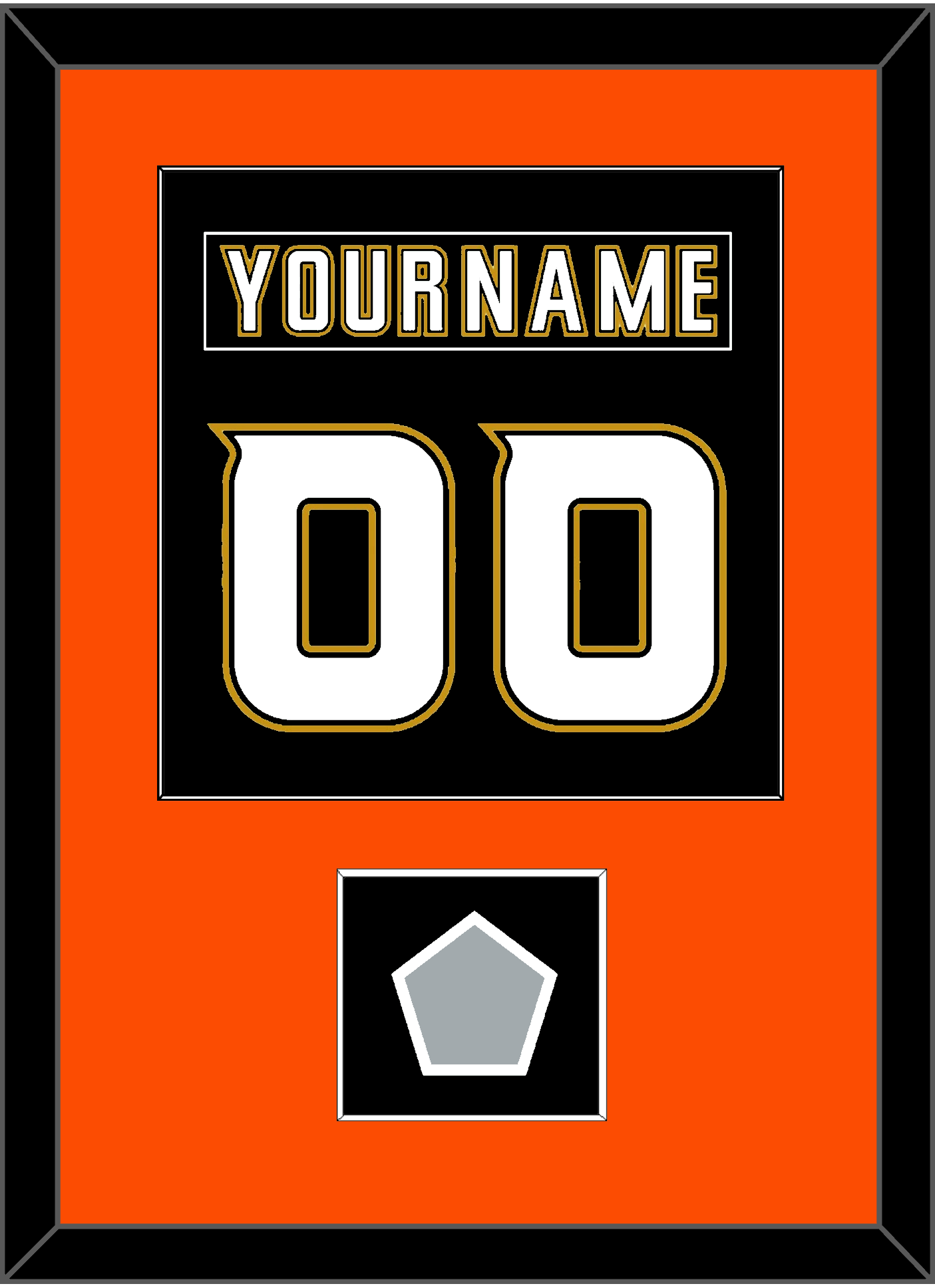 Anaheim Home Black Jersey (2006 Through 2014) Nameplate & Number (From The Back Of The Jersey) With 2007 Stanley Cup Finals Patch. Single Mat Cut: Orange Mat With Black Nameplate, White Number & Patch Mounted On A Black Mat. Black Or White Frame.