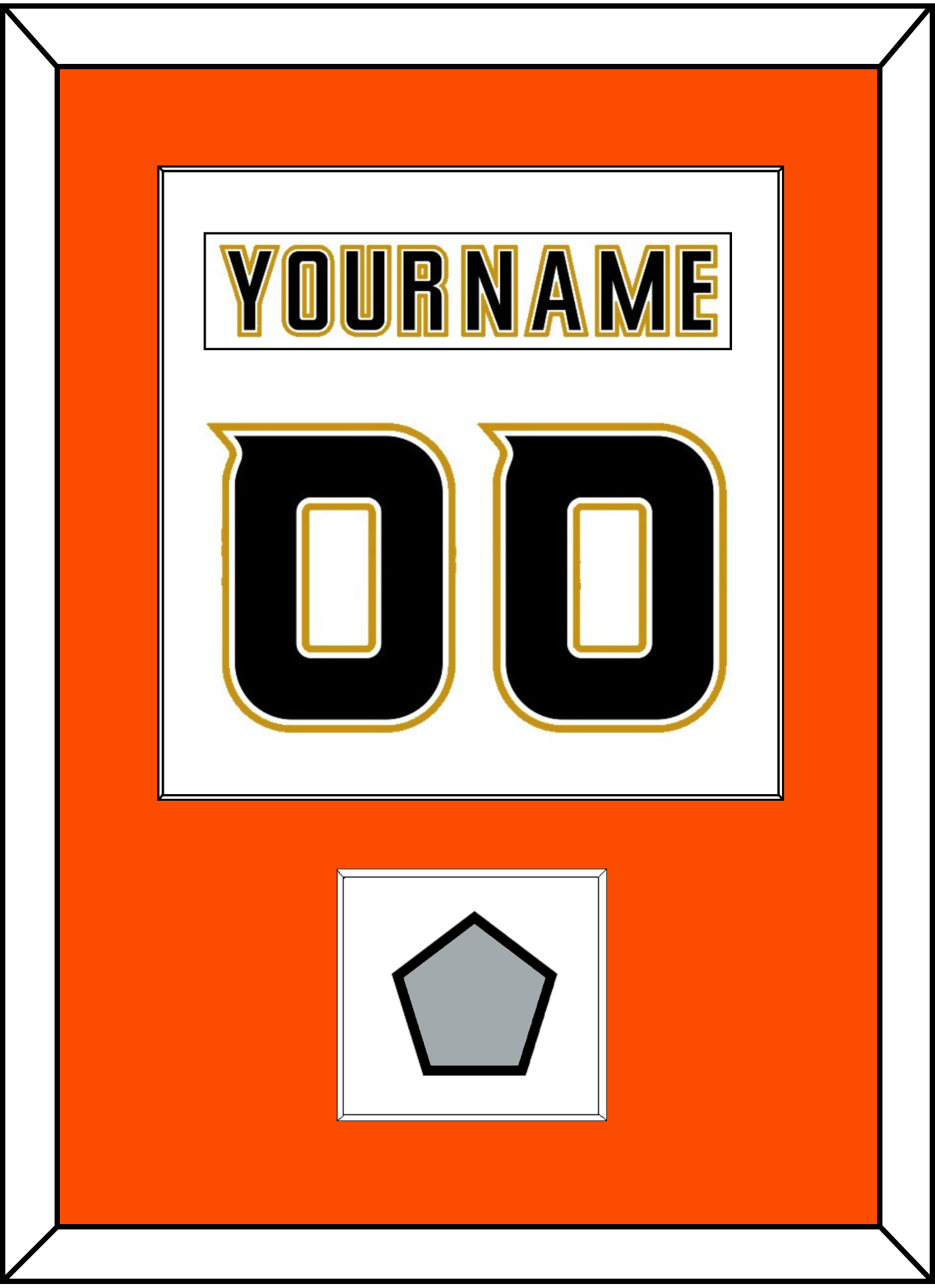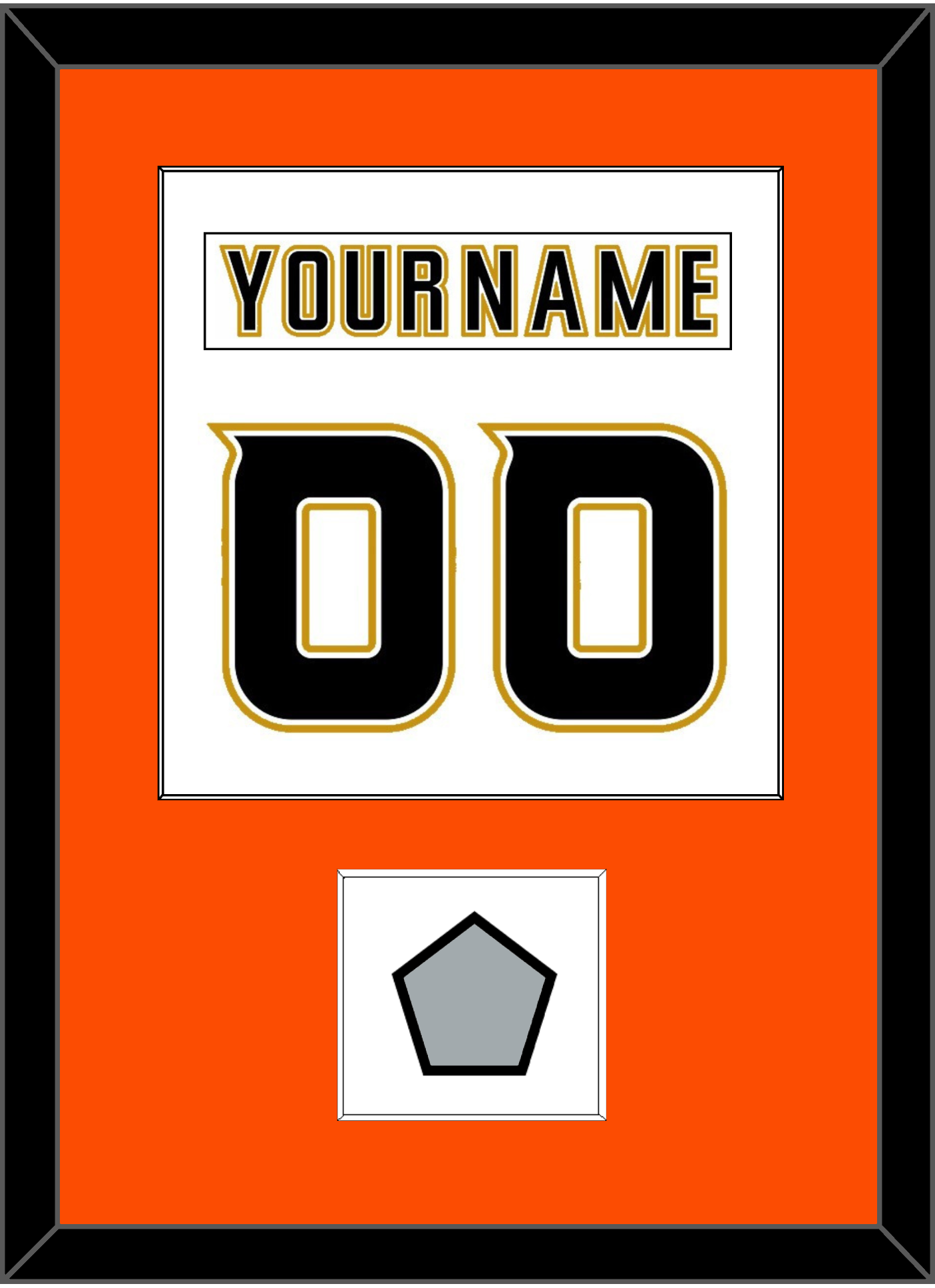 Anaheim Road White Jersey (2006 Through 2014) Nameplate & Number (From The Back Of The Jersey) With 2007 Stanley Cup Finals Patch.  Single Mat Cut:  Orange Mat With White Nameplate, Black Number & Patch Mounted On A White Mat.  Black Or White Frame.