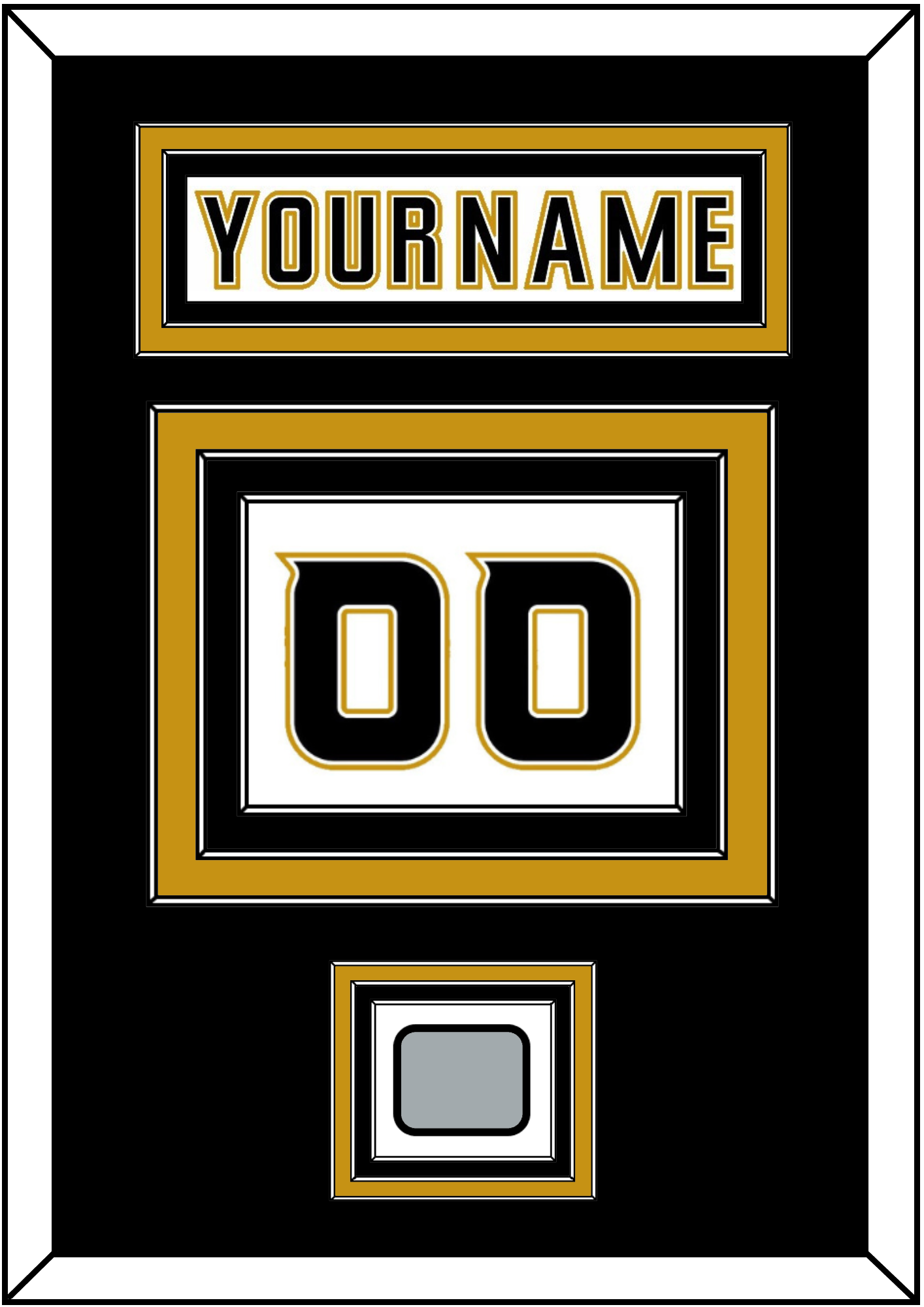 Anaheim Road White Jersey (2006 Through 2014) Nameplate & Numbers (From The Back Of The Jersey) With 2007 Stanley Cup Champions Patch. Nameplate Is Double Mat Cut: Black Mat Over A Gold Mat. White Nameplate Mounted On A Black Mat. To Match The Jersey, Number & Patch Are Triple Mat Cut: Black Mat Over A Gold Mat Over A Black Mat. Black Number & Patch Mounted On A White Mat. White Frame.