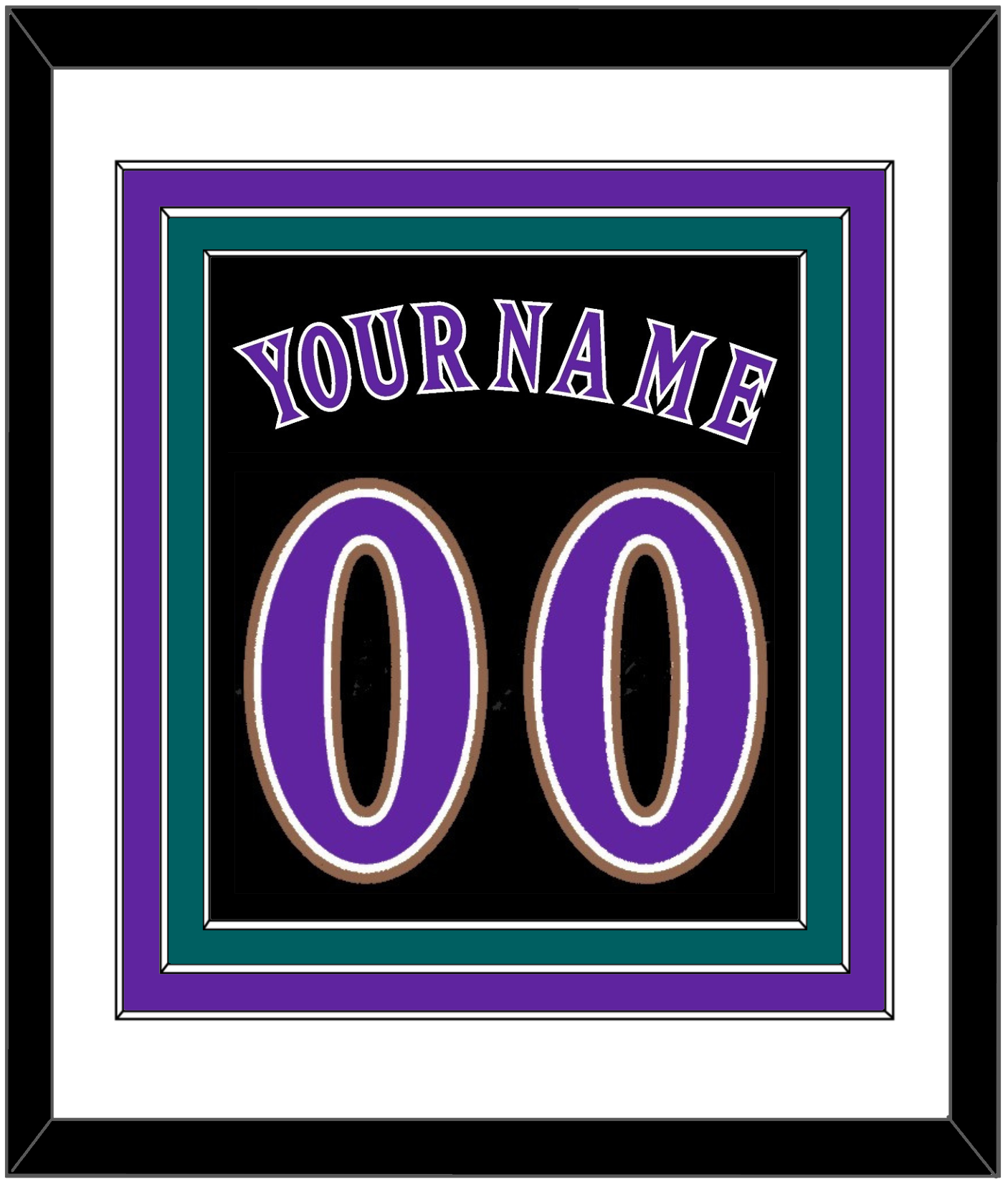 Arizona Alternate Black Jersey (2001 Through 2006) Name & Number.  Triple Mat: White Mat Over A Purple Mat Over A Teal Mat.  Purple Name And Number Mounted On A Black Mat.  Black Frame.