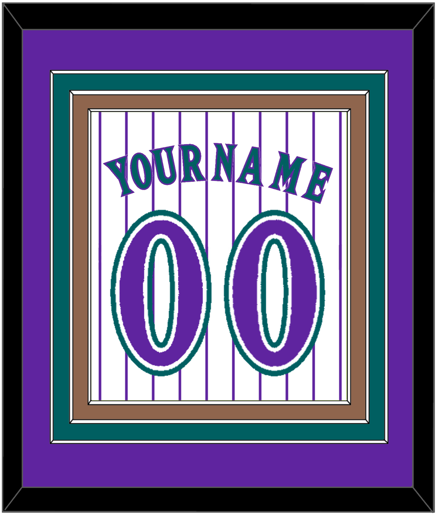Arizona Alternate Home White Pinstripes Jersey (1998 Through 2006) Name & Number. Triple Mat: Purple Mat Over A Teal Mat Over A Copper Mat. Purple Name And Number Mounted On Pinstripes Background. White Or Black Frame.