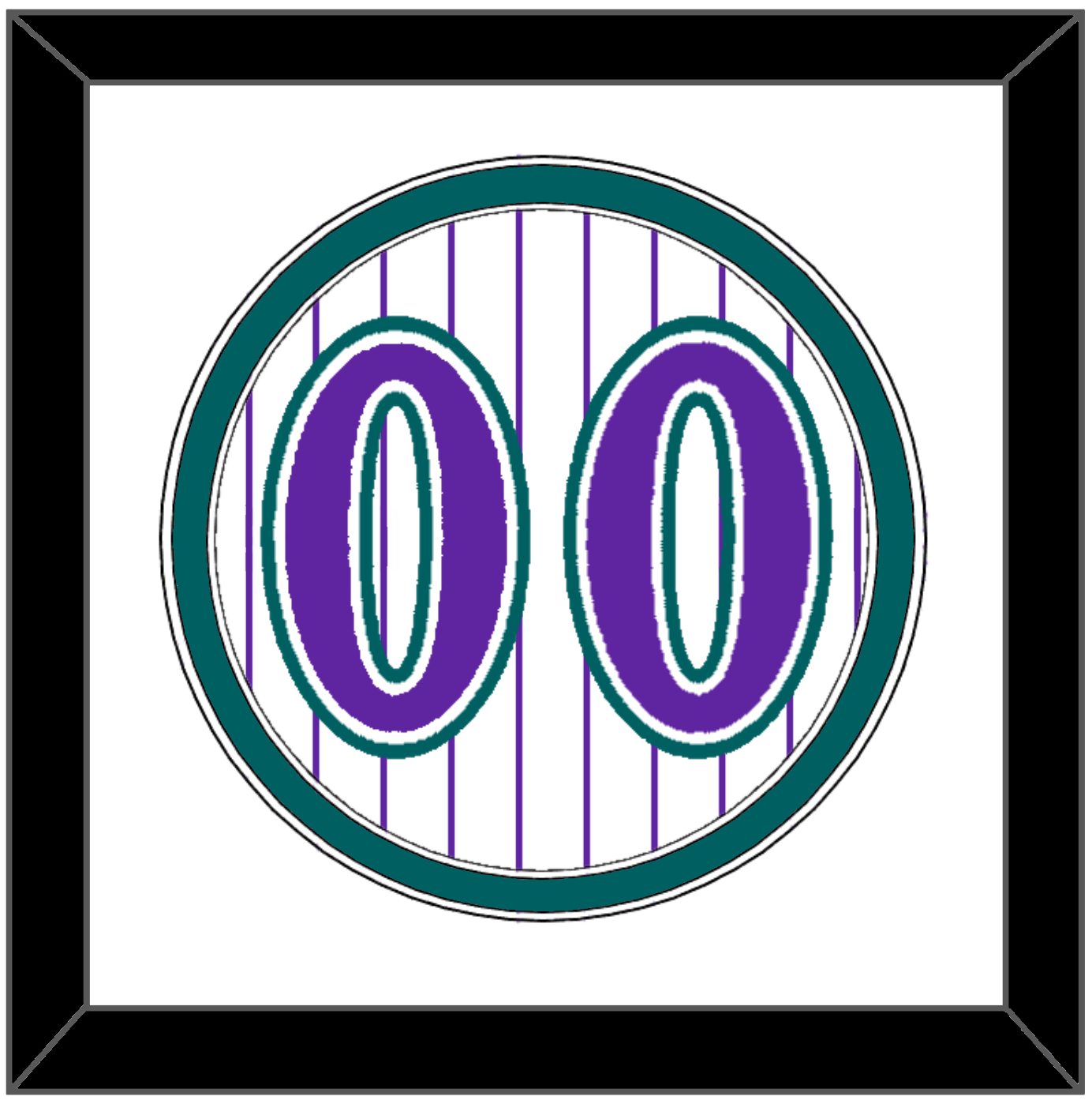 Arizona Alternate Home White Pinstripe Jersey (1998 Through 2006) Number. Double Mat: White Mat Over A Teal Mat. Purple Numbers Mounted On Pinstripe Background. Black Frame.