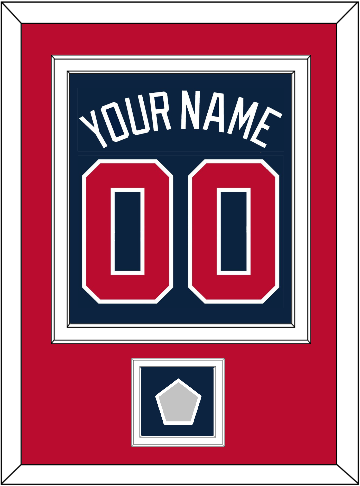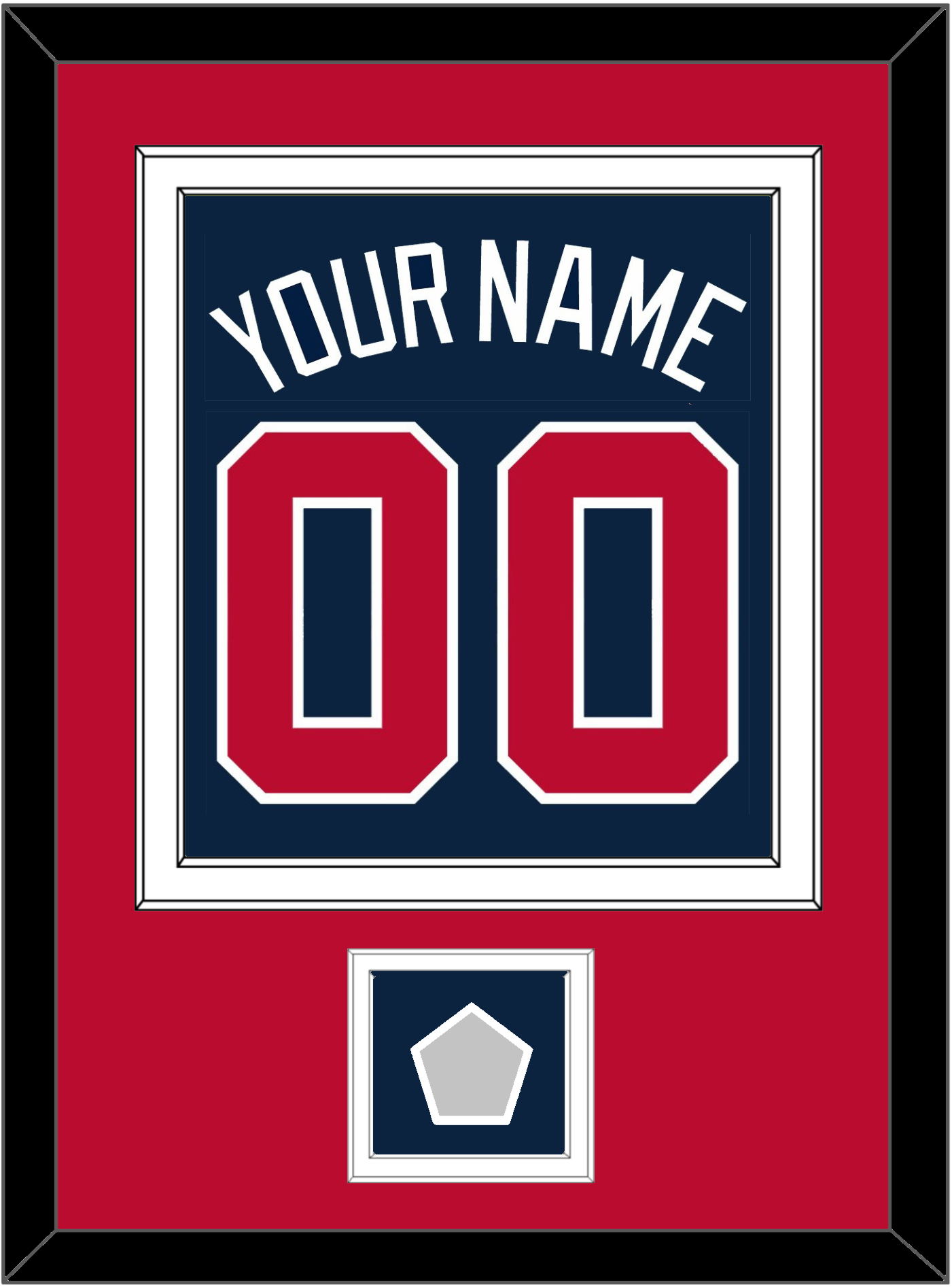 Atlanta Alternate Road Blue Jersey Name & Number With 2021 World Series Champions Patch. Double Mat Cut: Red Mat Over A White Mat. White Name, Red Number & Patch Mounted On A Blue Mat. White Or Black Frame.