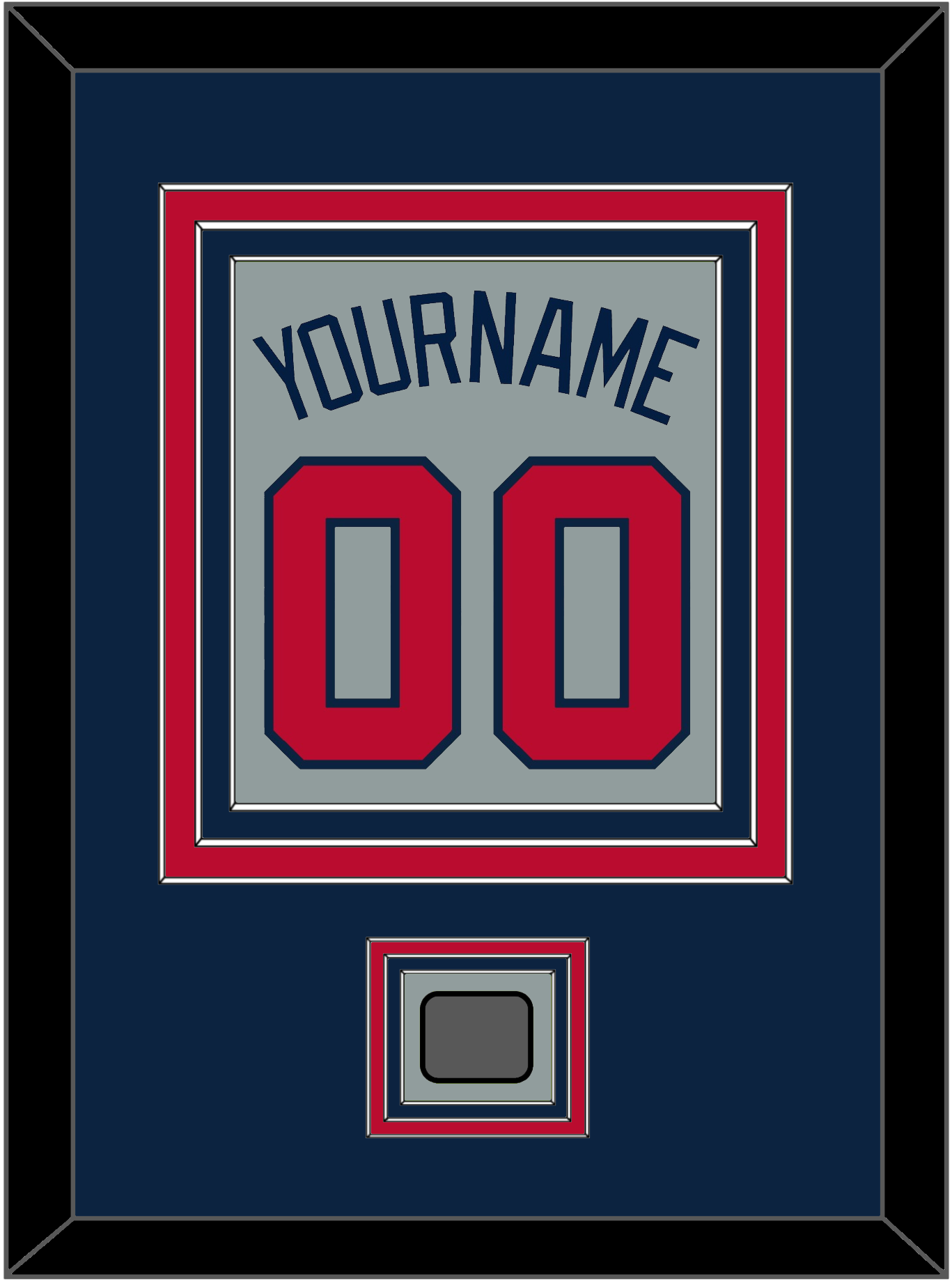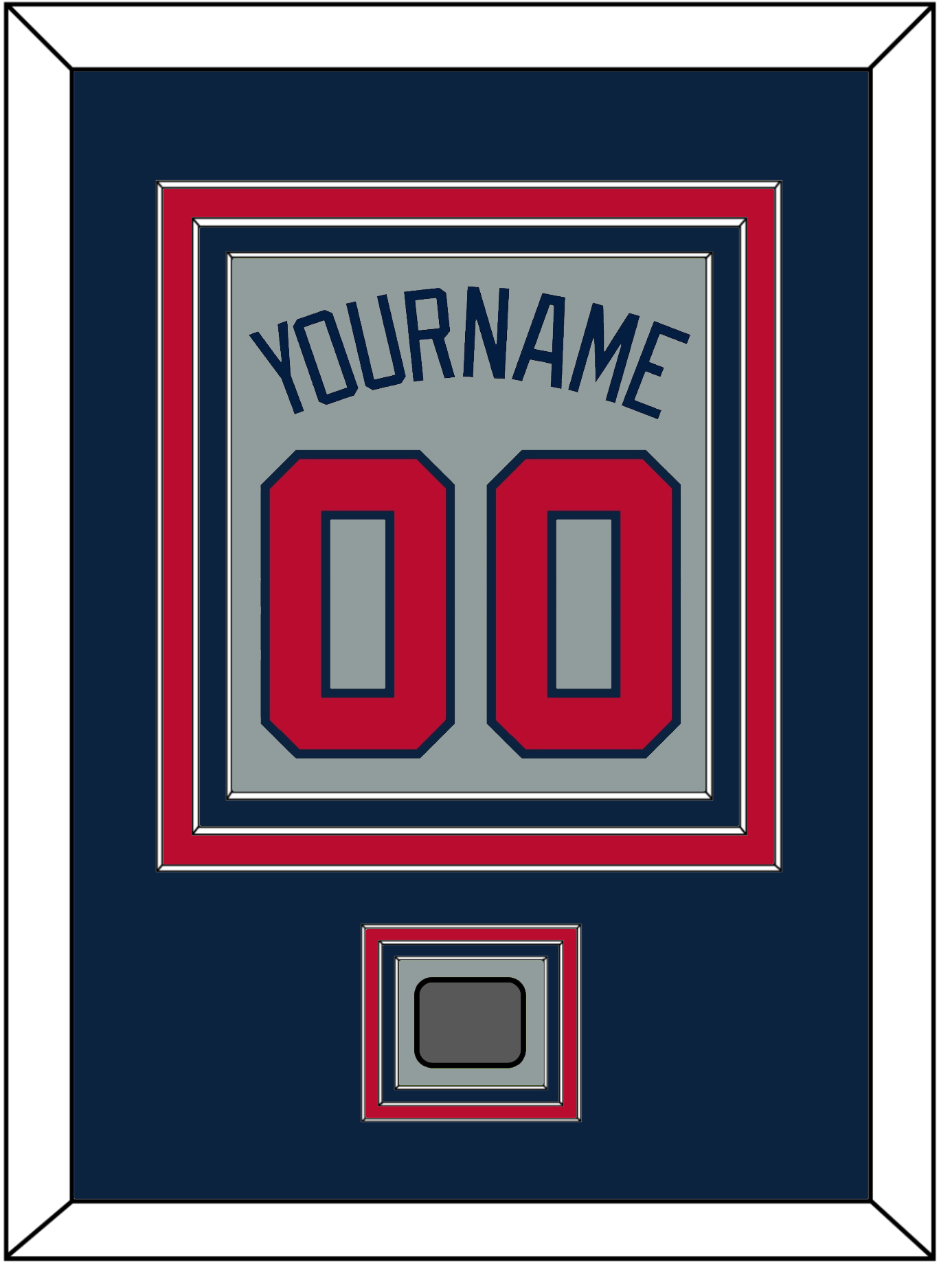 Atlanta Road Gray Jersey Name & Number With 2021 World Series Champions Patch. Triple Mat Cut: Blue Mat Over Red Mat, Over A Blue Mat. Blue Name, Red Number & Patch Mounted On A Gray Mat. White Or Black Frame.