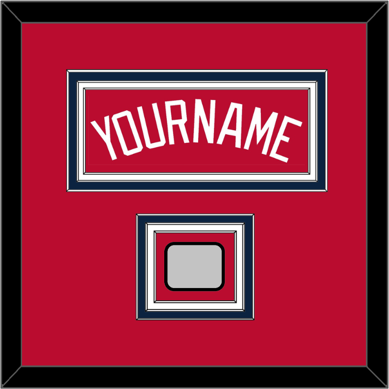 Atlanta Alternate Home Red Jersey Name With 2021 World Series Champions Patch. Triple Mat Cut: Red Mat Over A Blue Mat Over A White Mat. White Name & Patch Mounted On A Red Mat. White Or Black Frame.