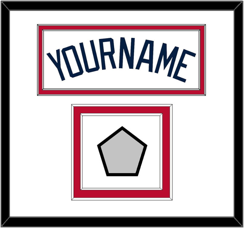 Atlanta Home White Jersey Name With 2021 World Series Champions Patch. Double Mat Cut: White Mat Over A Red Mat. Blue Name & Patch Mounted On A White Mat. Black Frame.