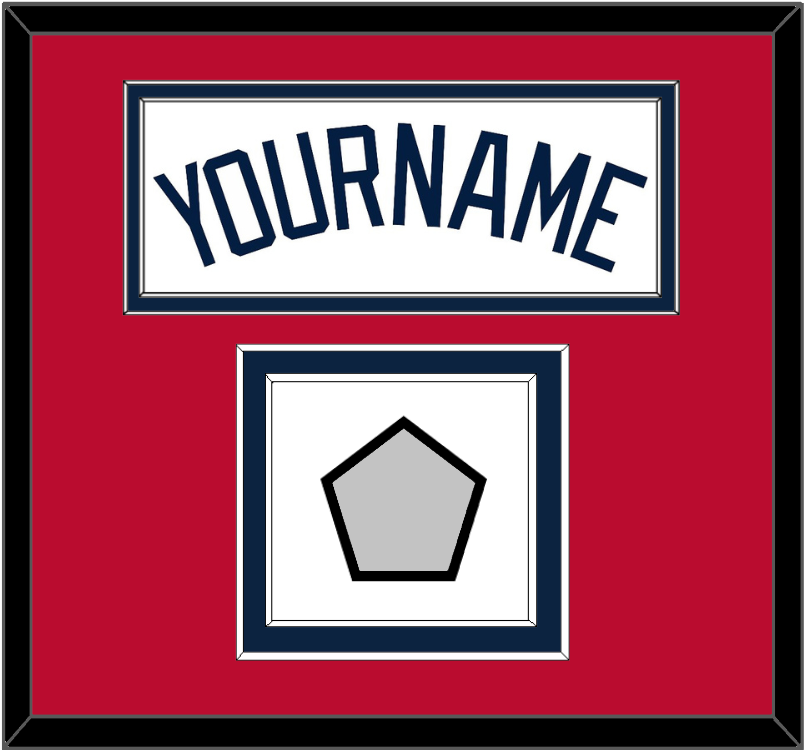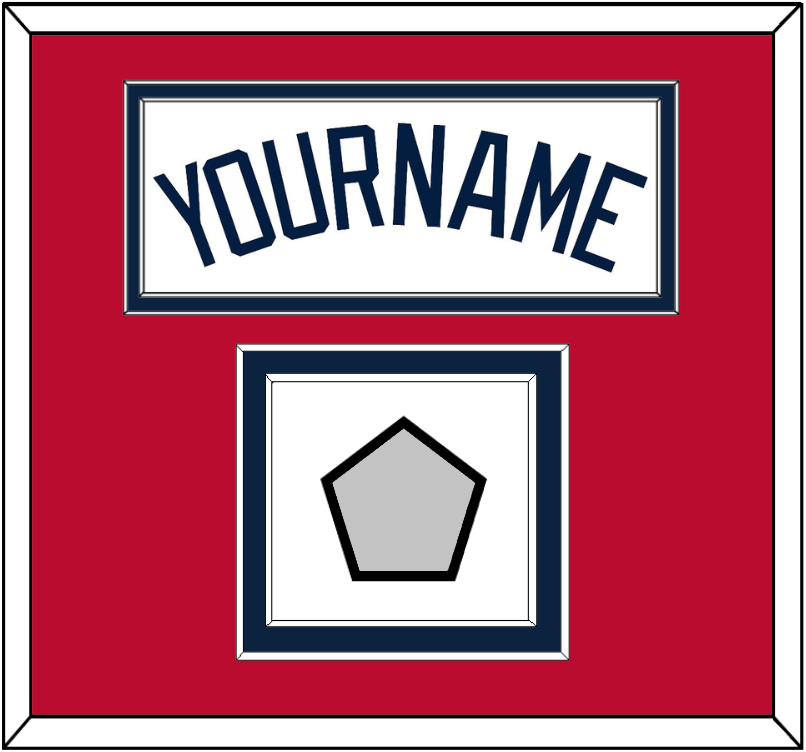Atlanta Home White Jersey Name With 2021 World Series Champions Patch. Double Mat Cut: Red Mat Over A Blue Mat. Blue Name & Patch Mounted On A White Mat. White Or Black Frame.